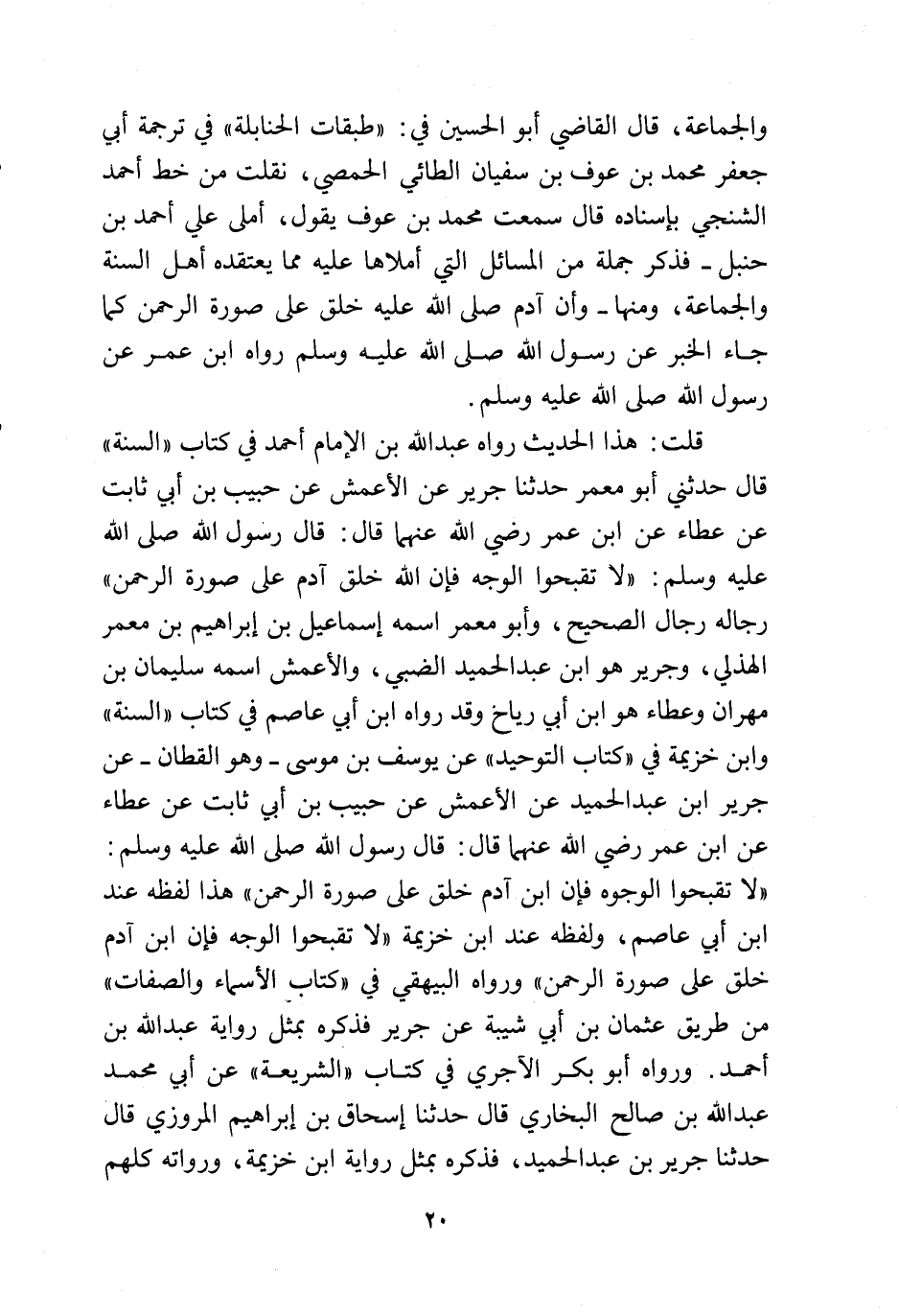 قلت: هذا الحديث رواه عبد الله بن الإمام أحمد في كتاب «السنة» قال حدثني أبو معمر حدثنا جرير عن الأعمش عن حبيب بن أبي ثابت عن عطاء عن ابن عمر رضي الله عنهما قال: قال رسول الله صلى الله عليه وسلم: «لا تقبحوا الوجه فإن الله خلق آدم على صورة الرحمن» رجاله رجال الصحيح، وأبو معمر اسمه إسماعيل بن إبراهيم بن معمر الهذلي، وجرير هو ابن عبد الحميد الضبي، والأعمش اسمه سليمان بن مهران وعطاء هو ابن أبي رباح وقد رواه ابن أبي عاصم في كتاب «السنة» وابن خزيمة في «كتاب التوحيد» عن يوسف بن موسى -وهو القطان- عن جرير ابن عبد الحميد عن الأعمش عن حبيب بن أبي ثابت عن عطاء عن ابن عمر رضي الله عنهما قال: قال رسول الله صلى الله عليه وسلم: «لا تقبحوا الوجه فإن ابن آدم خلق على صورة الرحمن» هذا لفظه عند ابن أبي عاصم، ولفظه عند ابن خزيمة «لا تقبحوا الوجه فإن ابن آدم خلق على صورة الرحمن» ورواه البيهقي في «كتاب الأسماء والصفات» من طريق عثمان بن أبي شيبة عن جرير فذكره بمثل رواية عبد الله بن أحمد. ورواه أبو بكر الآجري في كتاب «الشريعة» عن أبي محمد عبد الله بن صالح البخاري قال حدثنا إسحاق بن إبراهيم المروزي قال حدثنا جرير بن عبد الحميد، فذكره بمثل رواية ابن خزيمة، ورواته كلهم
