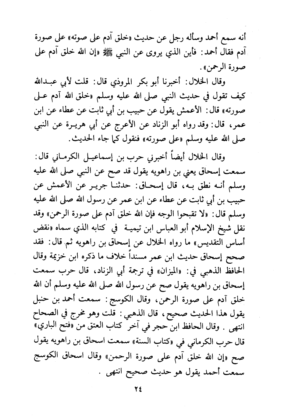 وقال الخلال أيضاً أخبرني حرب بن إسماعيل الكرماني قال: سمعت إسحاق يعني بن راهويه يقول قد صح عن النبي صلى الله عليه وسلم أنه نطق به، قال إسحاق: حدثنا جرير عن الأعمش عن حبيب بن أبي ثابت عن عطاء عن ابن عمر عن رسول الله صلى الله عليه وسلم قال: «لا تقبحوا الوجه فإن الله خلق آدم على صورة الرحمن» وقد نقل شيخ الإسلام أبو العباس ابن تيمية في كتابه الذي سماه «نقض أساس التقديس» ما رواه الخلال عن إسحاق بن راهويه ثم قال: فقد صحح إسحاق حديث ابن عمر مسنداً خلاف ما ذكره ابن خزيمة وقال الحافظ الذهبي في: «الميزان» في ترجمة أبي الزناد، قال حرب سمعت إسحاق بن راهويه يقول صح عن رسول الله صلى الله عليه وسلم أن الله خلق آدم على صورة الرحمن، وقال الكوسج: سمعت أحمد بن حنبل يقول هذا الحديث صحيح، قال الذهبي: قلت وهو مخرج في الصحاح انتهى .. وقال الحافظ ابن حجر في آخر كتاب العتق من «فتح الباري» قال حرب الكرماني في «كتاب السنة» سمعت إسحاق بن راهويه يقول صح «إن الله خلق آدم على صورة الرحمن» وقال إسحاق الكوسج سمعت أحمد يقول هو حديث صحيح انتهى.