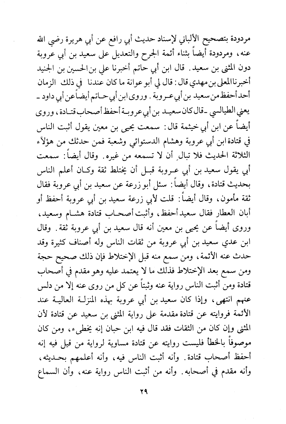 وقال ابن عدي سعيد بن أبي عروبة من ثقات الناس وله أصناف كثيرة وقد حدث عنه الأئمة، ومن سمع منه قبل الاختلاط فإن ذلك صحيح حجة ومن سمع بعد الاختلاط فذلك ما لا يعتمد عليه وهو مقدم في أصحاب قتادة ومن أثبت الناس رواية عنه وثبتاً عن كل من روى عنه إلا من دلس عنهم انتهى، وإذا كان سعيد بن أبي عروبة بهذه المنزلة العالية عند الأئمة فروايته عن قتادة مقدمة على رواية المثنى بن سعيد عن قتادة لأن المثنى وإن كان من الثقات فقد قال فيه ابن حبان إنه يخطئ، ومن كان موصوفاً بالخطأ فليست روايته عن قتادة مساوية لرواية من قيل فيه إنه أحفظ أصحاب قتادة. وأنه أثبت الناس فيه، وأنه أعلمهم بحديثه، وأنه مقدم في أصحابه. وأنه من أثبت الناس رواية عنه، وأن السماع