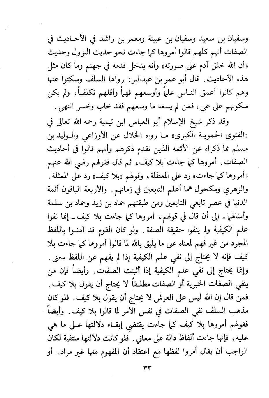 وقد ذكر شيخ الإسلام أبو العباس ابن تيمية رحمه الله تعالى في «الفتوى الحموية الكبرى» ما رواه الخلال عن الأوزاعي والوليد بن مسلم مما ذكراه عن الأئمة الذين تقدم ذكرهم وأنهم قالوا في أحاديث الصفات. أمروها كما جاءت بلا كيف، ثم قال فقولهم رضي الله عنهم «أمروها كما جاءت» رد على المعطلة، وقولهم «بلا كيف» رد على الممثلة. والزهري ومكحول هما أعلم التابعين في زمانهم. والأربعة الباقون أئمة الدنيا في عصر تابعي التابعين ومن طبقتهم حماد بن زيد وحماد بن سلمة وأمثالهما - إلى أن قال في قولهم، أمروها كما جاءت بلا كيف - إنما نفوا علم الكيفية ولم ينفوا حقيقة الصفة. ولو كان القوم قد آمنوا باللفظ المجرد من غير فهم لمعناه على ما يليق بالله لما قالوا أمروها كما جاءت بلا كيف فإنه لا يحتاج إلى نفي علم الكيفية إذا لم يفهم عن اللفظ معنى. وإنما يحتاج إلى نفي علم الكيفية إذا أثبتت الصفات. وأيضاً فإن من ينفي الصفات الخبرية أو الصفات مطلقاً لا يحتاج أن يقول بلا كيف. فمن قال إن الله ليس على العرش لا يحتاج أن يقول بلا كيف. فلو كان مذهب السلف نفي الصفات في نفس الأمر لما قالوا بلا كيف. وأيضاً فقولهم أمروها بلا كيف كما جاءت يقتضي إبقاء دلالتها على ما هي عليه، فإنها جاءت ألفاظ دالة على معاني. فلو كانت دلالتها منتفية لكان الواجب أن يقال أمروا لفظها مع اعتقاد أن المفهوم منها غير مراد. أو