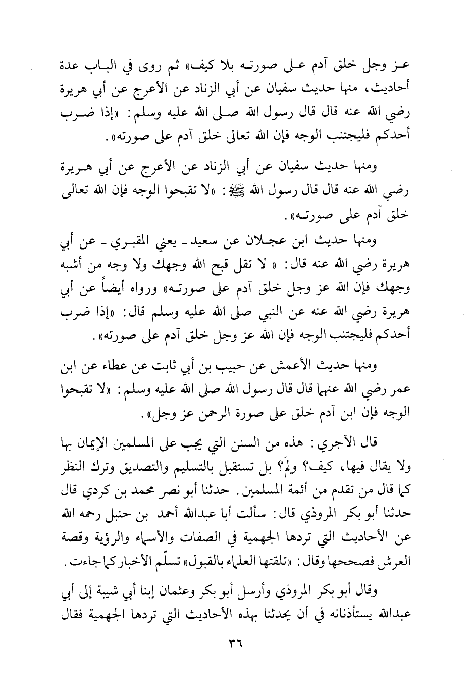 عز وجل خلق آدم على صورته بلا كيف» ثم روى في الباب عدة أحاديث، منها حديث سفيان عن أبي الزناد عن الأعرج عن أبي هريرة رضي الله عنه قال قال رسول الله صلى الله عليه وسلم: «إذا ضرب أحدكم فليجتنب الوجه فإن الله تعالى خلق آدم على صورته».