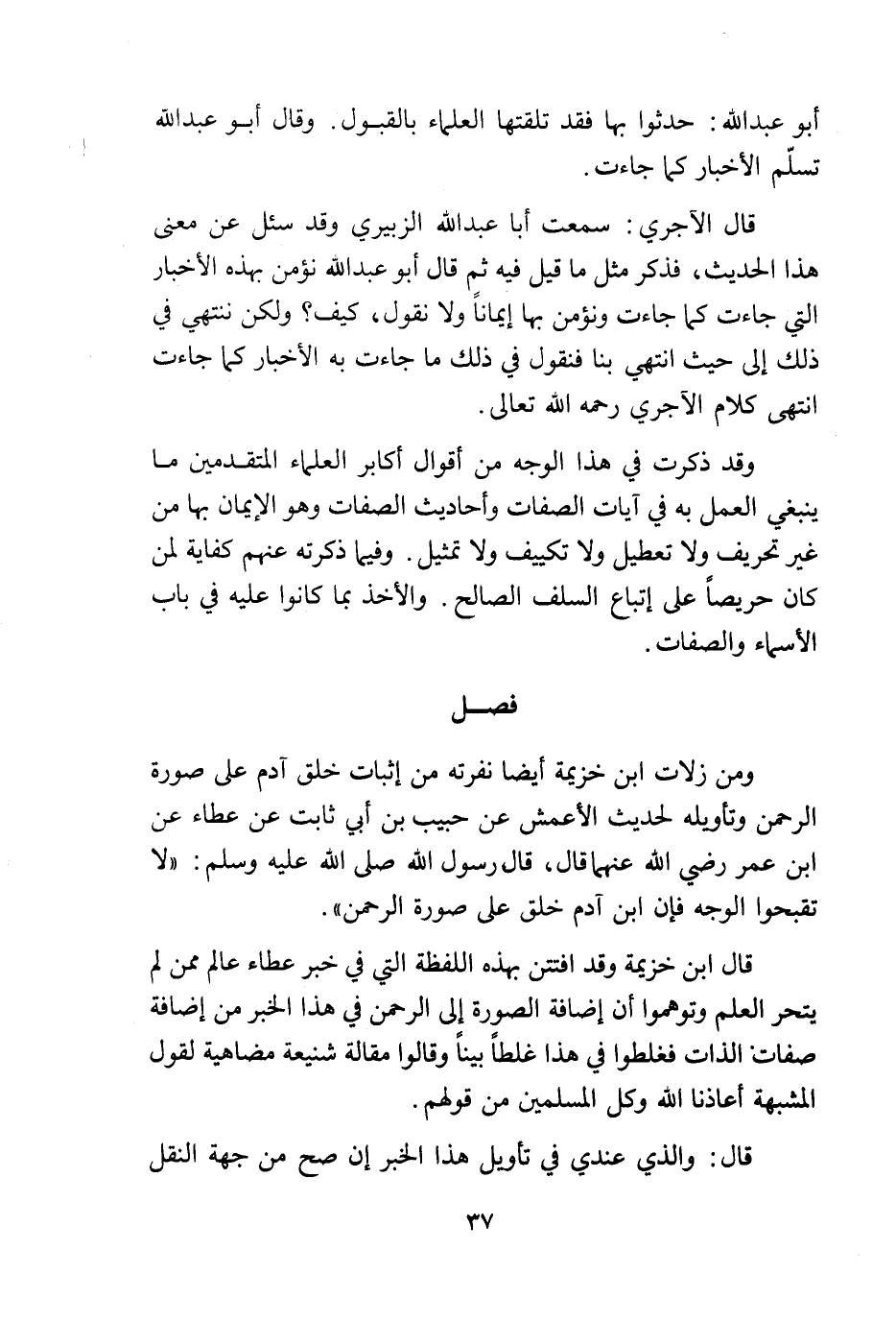قال ابن خزيمة وقد افتتن بهذه اللفظة التي في خبر عطاء عالم ممن لم يتحر العلم وتوهموا أن إضافة الصورة إلى الرحمن في هذا الخبر من إضافة صفات الذات فغلطوا في هذا غلطاً بيناً وقالوا مقالة شنيعة مضاهية لقول المشبهة أعاذنا الله وكل المسلمين من قولهم.