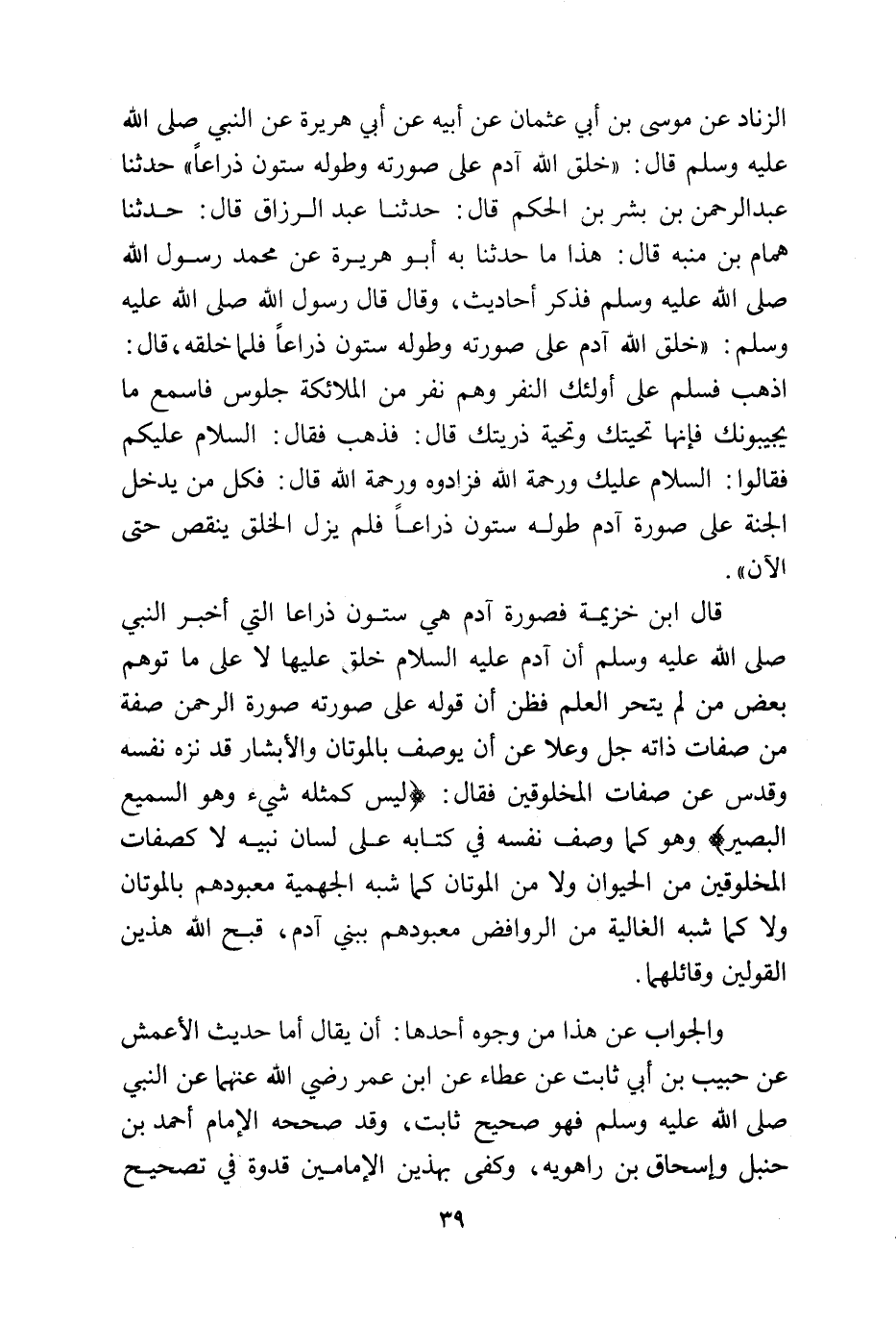 الزناد عن موسى بن أبي عثمان عن أبيه عن أبي هريرة عن النبي صلى الله عليه وسلم قال: «خلق الله آدم على صورته وطوله ستون ذراعاً» حدثنا عبد الرحمن بن بشر بن الحكم قال: حدثنا عبد الرزاق قال: حدثنا همام بن منبه قال: هذا ما حدثنا به أبو هريرة عن محمد رسول الله صلى الله عليه وسلم فذكر أحاديث، وقال قال رسول الله صلى الله عليه وسلم: «خلق الله آدم على صورته وطوله ستون ذراعاً فلما خلقه، قال: اذهب فسلم على أولئك النفر وهم نفر من الملائكة جلوس فاسمع ما يجيبونك فإنها تحيتك وتحية ذريتك قال: فذهب فقال: السلام عليكم فقالوا: السلام عليك ورحمة الله فزادوه ورحمة الله قال: فكل من يدخل الجنة على صورة آدم طوله ستون ذراعاً فلم يزل الخلق ينقص حتى الآن».