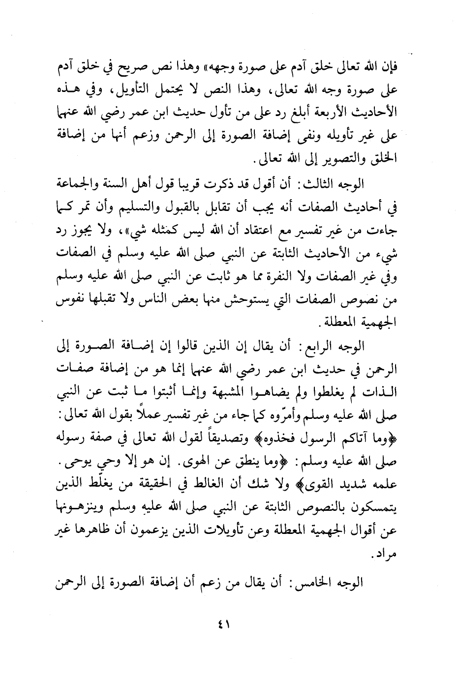 الوجه الرابع: أن يقال إن الذين قالوا إن إضافة الصورة إلى الرحمن في حديث ابن عمر رضي الله عنهما إنما هو من إضافة صفات الذات لم يغلطوا ولم يضاهوا المشبهة وإنما أثبتوا ما ثبت عن النبي صلى الله عليه وسلم وأمروه كما جاء من غير تفسير عملاً بقول الله تعالى: {وَمَا آتَاكُمُ الرَّسُولُ فَخُذُوهُ} [الحشر: 7]، وتصديقاً لقول الله تعالى في صفة رسوله صلى الله عليه وسلم: {وَمَا يَنْطِقُ عَنِ الْهَوَى (3) إِنْ هُوَ إِلَّا وَحْيٌ يُوحَى (4) عَلَّمَهُ شَدِيدُ الْقُوَى (5)} [النجم: 3 - 5]، ولا شك أن الغالط في الحقيقة من يغلط الذين يتمسكون بالنصوص الثابتة عن النبي صلى الله عليه وسلم وينزهونا عن أقوال الجهمية المعطلة وعن تأويلات الذين يزعمون أن ظاهرها غير مراد.