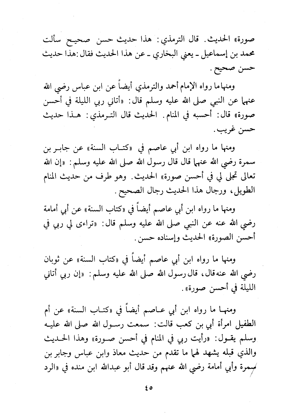 ومنها ما رواه ابن أبي عاصم في «كتاب السنة» عن جابر بن سمرة رضي الله عنهما قال قال رسول الله صلى الله عليه وسلم: «إن الله تعالى تجلى لي في أحسن صورة» الحديث. وهو طرف من حديث المنام الطويل، ورجال هذا الحديث رجال الصحيح.