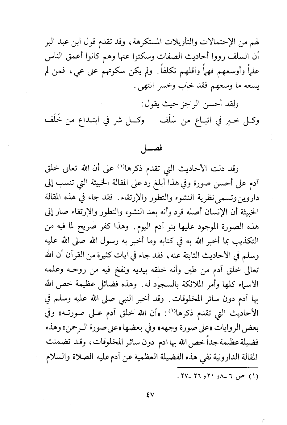 وقد دلت الأحاديث التي تقدم ذكرها (¬1) على أن الله تعالى خلق آدم على أحسن صورة وفي هذا أبلغ رد على المقالة الخبيثة التي تنسب إلى داروين وتسمى نظرية النشوء والتطور والارتقاء. فقد جاء في هذه المقالة الخبيثة أن الإنسان أصله قرد وأنه بعد النشوء والتطور والارتقاء صار إلى هذه الصورة الموجودة عليها بنو آدم اليوم. وهذا كفر صريح لما فيه من التكذيب بما أخبر الله به في كتابه وما أخبر به رسول الله صلى الله عليه وسلم في الأحاديث الثابتة عنه، فقد جاء في آيات كثيرة من القرآن أن الله تعالى خلق آدم من طين وأنه خلقه بيديه ونفخ فيه من روحه وعلمه الأسماء كلها وأمر الملائكة بالسجود له. وهذه فضائل عظيمة خص الله بها آدم دون سائر المخلوقات. وقد أخبر النبي صلى الله عليه وسلم في الأحاديث التي تقدم ذكرها: «أن الله خلق آدم على صورته» وفي بعض الروايات «على صورة وجهه» وفي بعضها «على صورة الرحمن» وهذه فضيلة عظيمة جداً خص الله بها آدم دون سائر المخلوقات، وقد تضمنت المقالة الدارونية نفي هذه الفضيلة العظيمة عن آدم عليه الصلاة والسلام