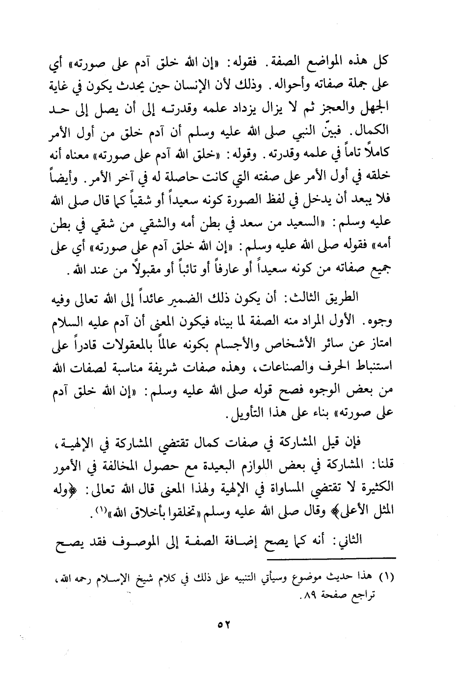 الطريق الثالث: أن يكون ذلك الضمير عائداً إلى الله تعالى وفيه وجوه. الأول المراد منه الصفة لما بيناه فيكون المعنى أن آدم عليه السلام امتاز عن سائر الأشخاص والأجسام بكونه عالماً بالمعقولات قادراً على استنباط الحرف والصناعات، وهذه صفات شريفة مناسبة لصفات الله من بعض الوجوه فصح قوله صلى الله عليه وسلم: «إن الله خلق آدم على صورته» بناء على هذا التأويل.