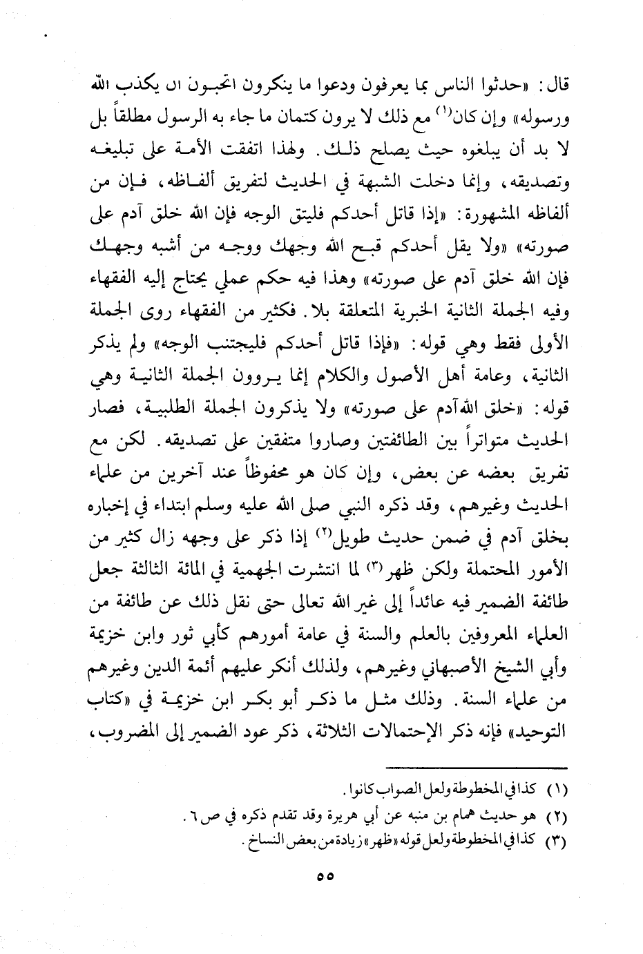 إذا ذكر على وجهه زال كثير من الأمور المحتملة ولكن ظهر (¬3) لما انتشرت الجهمية في المائة الثالثة جعل طائفة الضمير فيه عائداً إلى غير الله تعالى حتى نقل ذلك عن طائفة من العلماء المعروفين بالعلم والسنة في عامة أمورهم كأبي ثور وابن خزيمة وأبي الشيخ الأصبهاني وغيرهم، ولذلك أنكر عليهم أئمة الدين وغيرهم من علماء السنة. وذلك مثل ما ذكر أبو بكر ابن خزيمة في «كتاب التوحيد» فإنه ذكر الاحتمالات الثلاثة، ذكر عود الضمير إلى المضروب،