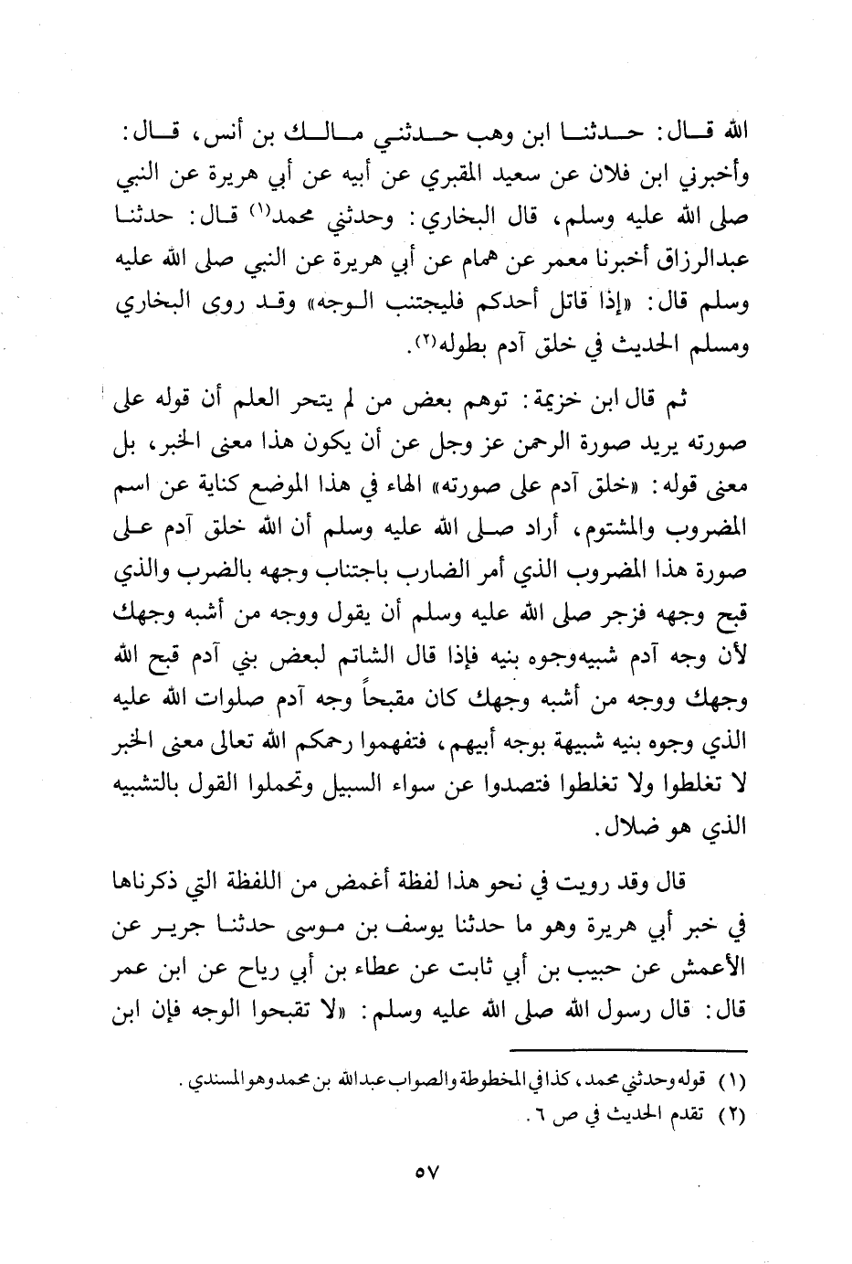 ثم قال ابن خزيمة: توهم بعض من لم يتحر العلم أن قوله على صورته يريد صورة الرحمن عز وجل عن أن يكون هذا معنى الخبر، بل معنى قوله: «خلق آدم على صورته» الهاء في هذا الموضع كناية عن اسم المضروب والمشتوم، أراد صلى الله عليه وسلم أن الله خلق آدم على صورة هذا المضروب الذي أمر الضارب باجتناب وجهه بالضرب والذي قبح وجهه فزجر صلى الله عليه وسلم أن يقول ووجه من أشبه وجهك لأن وجه آدم شبيه وجوه بنيه فإذا قال الشاتم لبعض بني آدم قبح الله وجهك ووجه من أشبه وجهك كان مقبحاً وجه آدم صلوات الله عليه الذي وجوه بنيه شبيهة بوجه أبيهم، فتفهموا رحمكم الله تعالى معنى الخبر لا تغلطوا ولا تغلطوا فتصدوا عن سواء السبيل وتحملوا القول بالتشبيه الذي هو ضلال.