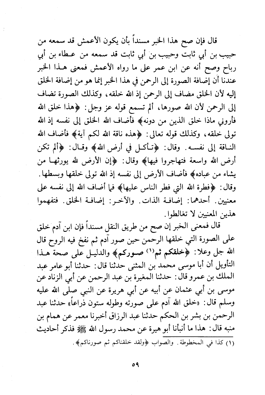 قال فإن صح هذا الخبر مسنداً بأن يكون الأعمش قد سمعه من حبيب بن أبي ثابت وحبيب بن أبي ثابت قد سمعه من عطاء بن أبي رباح وصح أنه عن ابن عمر على ما رواه الأعمش فمعنى هذا الخبر عندنا أن إضافة الصورة إلى الرحمن في هذا الخبر إنما هو من إضافة الخلق إليه لأن الخلق مضاف إلى الرحمن إذ الله خلقه، وكذلك الصورة تضاف إلى الرحمن لأن الله صورها، ألم تسمع قوله عز وجل: {هَذَا خَلْقُ اللَّهِ فَأَرُونِي مَاذَا خَلَقَ الَّذِينَ مِنْ دُونِهِ} [لقمان: 11]، فأضاف الله الخلق إلى نفسه إذ الله تولى خلقه، وكذلك قوله تعالى: {هَذِهِ نَاقَةُ اللَّهِ لَكُمْ آيَةً} [هود: 64]، فأضاف الله الناقة إلى نفسه وقال: {تَأْكُلْ فِي أَرْضِ اللَّهِ} [هود: 64]، وقال: {أَلَمْ تَكُنْ أَرْضُ اللَّهِ وَاسِعَةً فَتُهَاجِرُوا فِيهَا} [النساء: 97]، وقال: {إِنَّ الْأَرْضَ لِلَّهِ يُورِثُهَا مَنْ يَشَاءُ مِنْ عِبَادِه} [الأعراف: 128]، فأضاف الأرض إلى نفسه إذ الله تولى خلقها وبسطها، وقال: {فِطْرَتَ اللَّهِ الَّتِي فَطَرَ النَّاسَ عَلَيْهَا} [الروم: 30]، فما أضاف الله إلى نفسه على معنيين. أحدهما: إضافة الذات. والآخر: إضافة الخلق. فتفهموا هذين المعنيين لا تغالطوا.