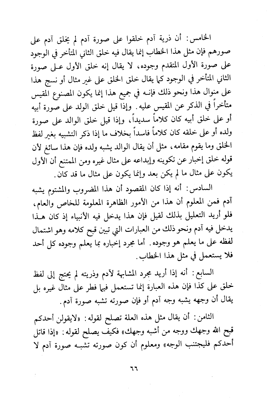 الخامس: أن ذرية آدم خلقوا على صورة آدم لم يخلق آدم على صورهم فإن مثل هذا الخطاب إنما يقال فيه خلق الثاني المتأخر في الوجود على صورة الأول المتقدم وجوده، لا يقال إنه خلق الأول على صورة الثاني المتأخر في الوجود كما يقال خلق الخلق على غير مثال أو نسج هذا على منوال هذا ونحو ذلك فإنه في جميع هذا إنما يكون المصنوع المقيس متأخراً في الذكر عن المقيس عليه. وإذا قيل خلق الولد على صورة أبيه أو على خلق أبيه كان كلاماً سديداً، وإذا قيل خلق الوالد على صورة ولده أو على خلقه كان كلاماً فاسداً بخلاف ما إذا ذكر التشبيه بغير لفظ الخلق وما يقوم مقامه، مثل أن يقال الوالد يشبه ولده فإن هذا سائغ لأن قوله خلق إخبار عن تكوينه وإبداعه على مثال غيره ومن الممتنع أن الأول يكون على مثال ما لم يكن بعد وإنما يكون على مثال ما قد كان.