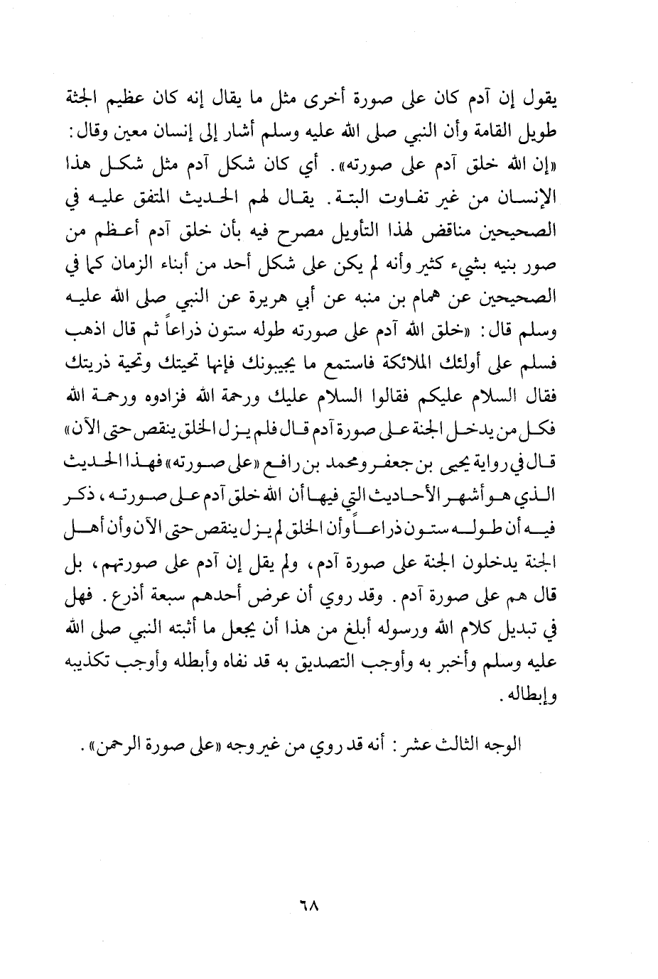يقول إن آدم كان على صورة أخرى مثل ما يقال إنه كان عظيم الجثة طويل القامة وأن النبي صلى الله عليه وسلم أشار إلى إنسان معين وقال: «إن الله خلق آدم على صورته». أي كان شكل آدم مثل شكل هذا الإنسان من غير تفاوت البتة. يقال لهم الحديث المتفق عليه في الصحيحين مناقض لهذا التأويل مصرح فيه بأن خلق آدم أعظم من صور بنيه بشيء كثير وأنه لم يكن على شكل أحد من أبناء الزمان كما في الصحيحين عن همام بن منبه عن أبي هريرة عن النبي صلى الله عليه وسلم قال: «خلق الله آدم على صورته طوله ستون ذراعاً ثم قال اذهب فسلم على أولئك الملائكة فاستمع ما يجيبونك فإنها تحيتك وتحية ذريتك فقال السلام عليكم فقالوا السلام عليك ورحمة الله فزادوه ورحمة الله فكل من يدخل الجنة على صورة آدم قال فلم يزل الخلق ينقص حتى الآن» قال في رواية يحيى بن جعفر ومحمد بن رافع «على صورته» فهذا الحديث الذي هو أشهر الأحاديث التي فيها أن الله خلق آدم على صورته، ذكر فيه أن طوله ستون ذراعاً وأن الخلق لم يزل ينقص حتى الآن وأن أهل الجنة يدخلون الجنة على صورة آدم، ولم يقل إن آدم على صورتهم، بل قال هم على صورة آدم. وقد روي أن عرض أحدهم سبعة أذرع. فهل في تبديل كلام الله ورسوله أبلغ من هذا أن يجعل ما أثبته النبي صلى الله عليه وسلم وأخبر به وأوجب التصديق به قد نفاه وأبطله وأوجب تكذيبه وإبطاله.