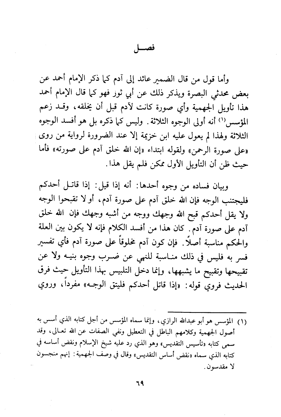 (¬1) المؤسس هو أبو عبد الله الرازي، وإنما سماه المؤسس من أجل كتابه الذي أسس به أصول الجهمية وكلامهم الباطل في التعطيل ونفي الصفات عن الله تعالى، وقد سمى كتابه «تأسيس التقديس» وهو الذي رد عليه شيخ الإسلام ونقض أساسه في كتابه الذي سماه «نقض أساس التقديس» وقال في وصف الجهمية: إنهم منجسون لا مقدسون.