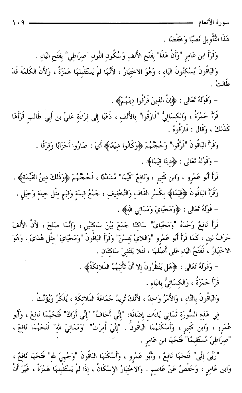 «رَبِّيَ إِنِّي» فَتَحَهَا نَافِعٌ، وَأَبُو عَمْرٍو، وَأَسْكَنَهَا الْبَاقُونَ «وَجْهِيَ لِلَّهِ» فَتَحَهَا نَافِعٌ، وَابْنُ عَامِرٍ، وَحَفْصٌ عَنْ عَاصِمٍ. وَالِاخْتِيَارُ الْإِسْكَانُ، إِذَا لَمْ يَسْتَقْبِلْهَا هَمْزَةٌ، غَيْرَ أَنَّ