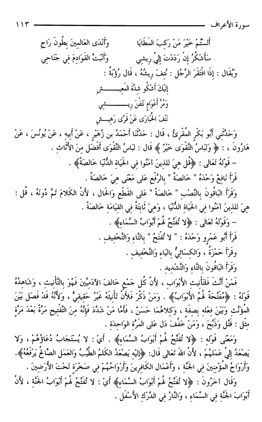 وَمَعْنَى قَوْلِهِ: {لَا تُفَتَّحُ لَهُمْ أَبْوَابُ السَّمَاءِ}. أَيْ: لَا يُسْتَجَابُ دعاؤهم، ولا يصعد إلي عَمَلُهُمْ، لِأَنَّ اللَّهَ تَعَالَى قَالَ: {إِلَيْهِ يَصْعَدُ الْكَلِمُ الطَّيِّبُ وَالْعَمَلُ الصَّالِحُ يَرْفَعُهُ}.