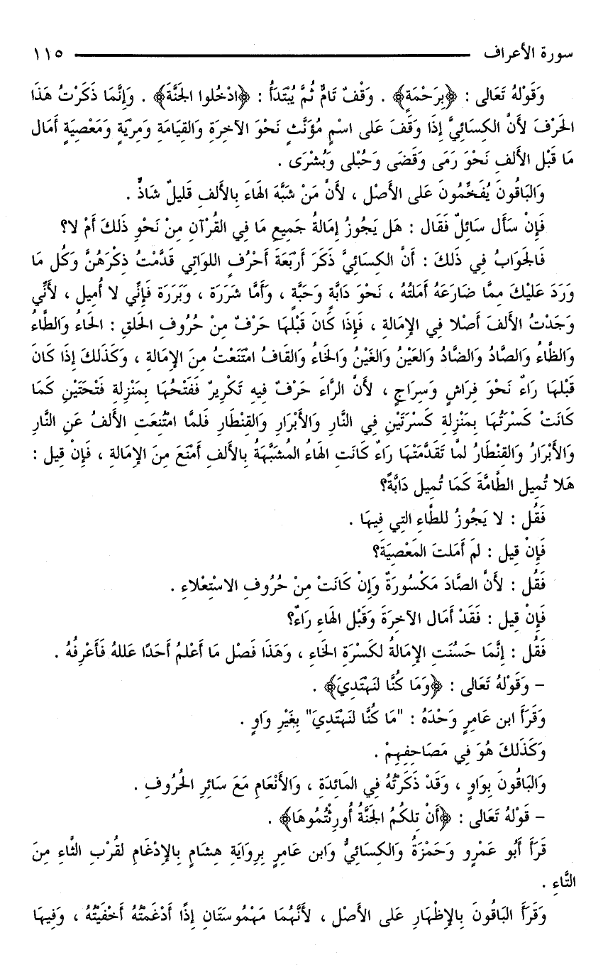 وَقَوْلُهُ تَعَالَى: {بِرَحْمَةٍ}. وَقْفٌ تَامٌّ ثُمَّ يُبْتَدَأُ: {ادْخُلُوُا الْجَنَّةَ}. وَإِنَّمَا ذَكَرْتُ هَذَا الْحَرْفَ لِأَنَّ الْكِسَائِيَّ إِذَا وَقَفَ عَلَى اسْمٍ مُؤَنَّثٍ نَحْوَ الْآخِرَةِ وَالِقِيَامَةِ وَمِرْيَةٍ وَمَعْصِيَةٍ أَمَالَ مَا قَبْلَ الْأَلِفِ نَحْوَ رَمَى وَقَضَى وَحُبْلَى وَبُشْرَى.