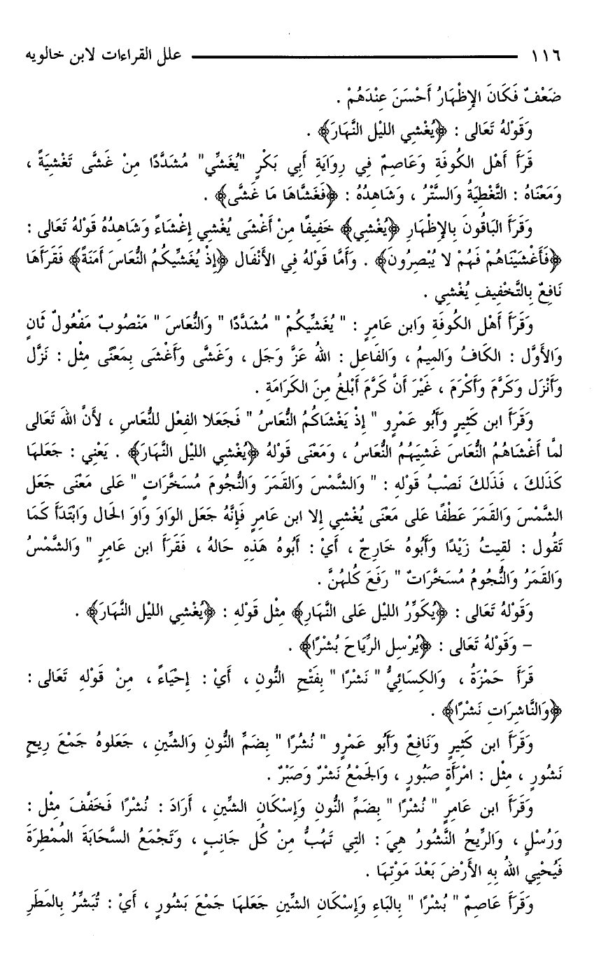 وقرأ الباقون بالإظهار «يُغْشِي» خَفِيفًا مِنْ أَغْشَى يُغْشِي إِغْشَاءً وَشَاهِدُهُ قَوْلُهُ تَعَالَى: