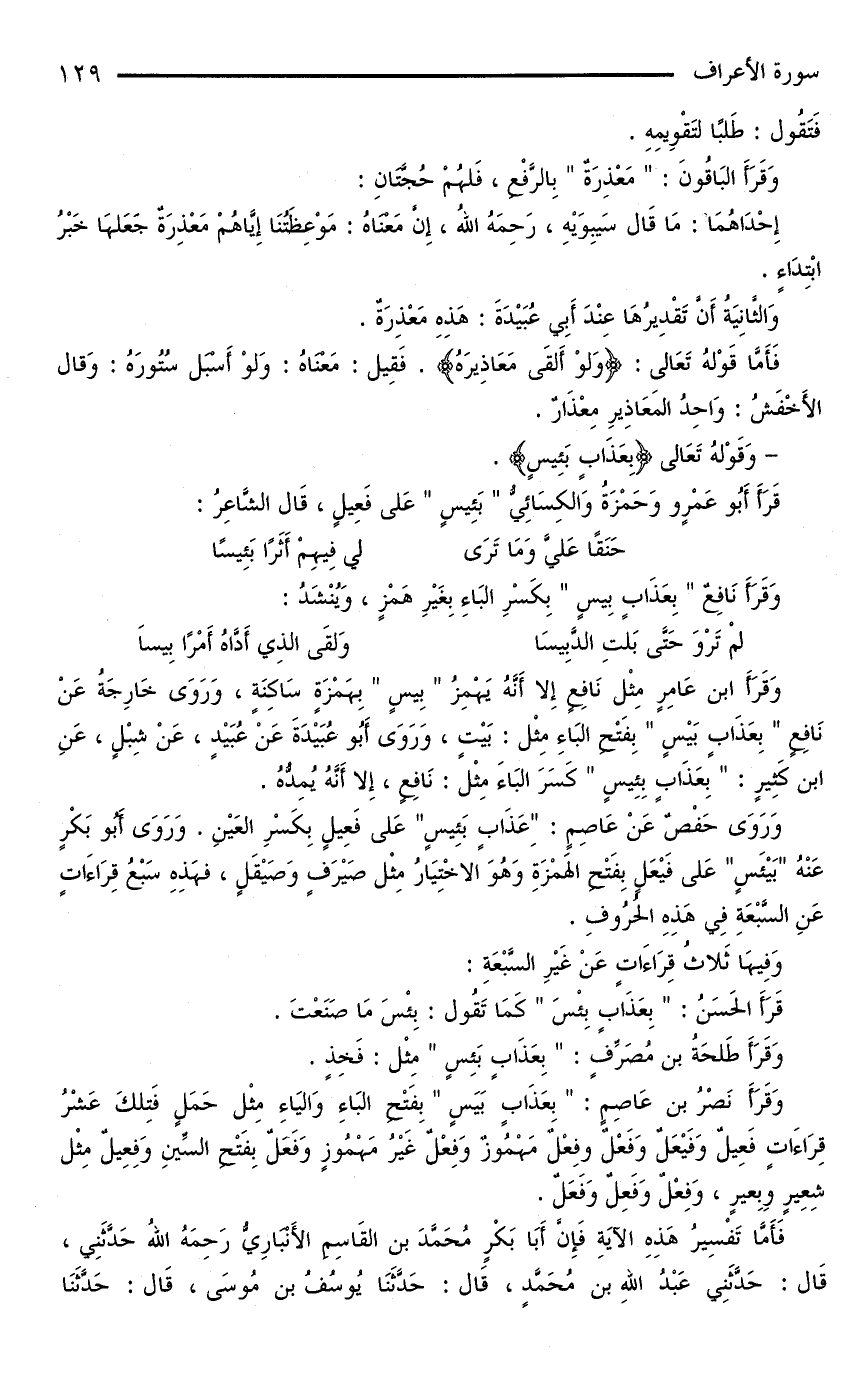 وَقَرَأَ نَصْرُ بْنُ عَاصِمٍ: «بِعَذَابٍ بَيَسٍ» بِفَتْحِ الْبَاءِ وَالْيَاءِ مِثْلَ حَمَلٍ فَتِلْكَ عَشْرُ قِرَاءَاتٍ فَعِيلٌ وَفَيْعَلٌ وَفَعْلٌ وفِعْلٌ مَهْمُوزٌ وَفِعْلٌ غَيْرُ مَهْمُوزٍ وَفَعَلٌ بِفَتْحِ السِّينِ وَفِعِيلٌ مِثْلُ شِعِيرٍ وِبِعيرٍ، وَفِعْلٌ وَفَعِلٌ وَفَعَلٌ.