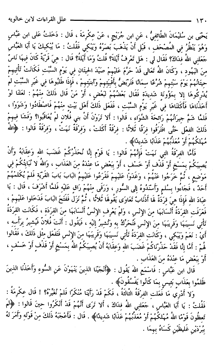 يَحْيَى بْنُ سُلَيْمَانَ الطَّائِفِيُّ، عَنِ ابْنِ جُرَيْجٍ، عَنْ عِكْرِمَةَ، قَالَ: دَخَلْتُ عَلَى ابْنِ عَبَّاسٍ وَهُوَ يَنْظُرُ فِي الْمُصْحَفِ، قَبْلَ أَنْ يَذْهَبَ بَصَرُهُ وَيَبْكِي فَقُلْتُ: مَا يُبْكِيكَ يَا أَبَا الْعَبَّاسِ جَعَلَنِي اللَّهُ فِدَاكَ؟ فَقَالَ لِي: هَلْ تَعْرِفُ أَيْلَةَ؟ قُلْتُ وَمَا أَيْلَةُ؟ قَالَ: هِيَ قَرْيَةٌ كَانَ فِيهَا نَاسٌ مِنَ الْيَهُودِ، وَكَانَ اللَّهُ تَعَالَى قَدْ حَرَّمَ عَلَيْهِمْ صَيْدَ الْحِيتَانِ فِي يَوْمِ السَّبْتِ فَكَانَتْ تَأْتِيهِمْ حِيتَانُهُمْ يَوْمَ سَبْتِهِمْ شُرَّعًا سِمَانًا فَتَرْبَضُّ بِأَقْبِيَتِهِمْ وَأَبْنِيَتِهِمْ، فَإِذَا طَلَبُوهَا فِي غَيْرِ السَّبْتِ لَمْ يُدْرِكُوهَا إِلَّا بمئونة شَدِيدَةٍ فَقَالَ بَعْضُهُمْ لِبَعْضٍ، أَوْ مَنْ قَالَ ذَلِكَ مِنْهُمْ: لَعَلَّنَا لَوْ أَخَذْنَاهَا فَأَكَلْنَاهَا فِي غَيْرِ يَوْمِ السَّبْتِ، فَفَعَلَ ذَلِكَ أَهْلُ بَيْتٍ مِنْهُمْ فَاصْطَادُوا وَشَوَوْا، فَلَمَّا شَمَّ جِيرَانُهُمْ رَائِحَةَ الشِّوَاءِ، قَالُوا: أَلَا تَرَوْنَ أَنَّ بَنِي فُلَانٍ لَمْ يُعَاقَبُوا؟ وَفَشَا فِيهِمْ ذَلِكَ الْفِعْلُ حَتَّى افْتَرَقُوا فِرَقًا ثَلَاثًا: فِرْقَةٌ أَكَلَتْ، وَفِرْقَةٌ نَهَتْ، وفرقة قالوا: {اللَّهُ مُهْلِكُهُمْ أَوْ مُعَذِّبُهُمْ عَذَابًا شَدِيدًا}.