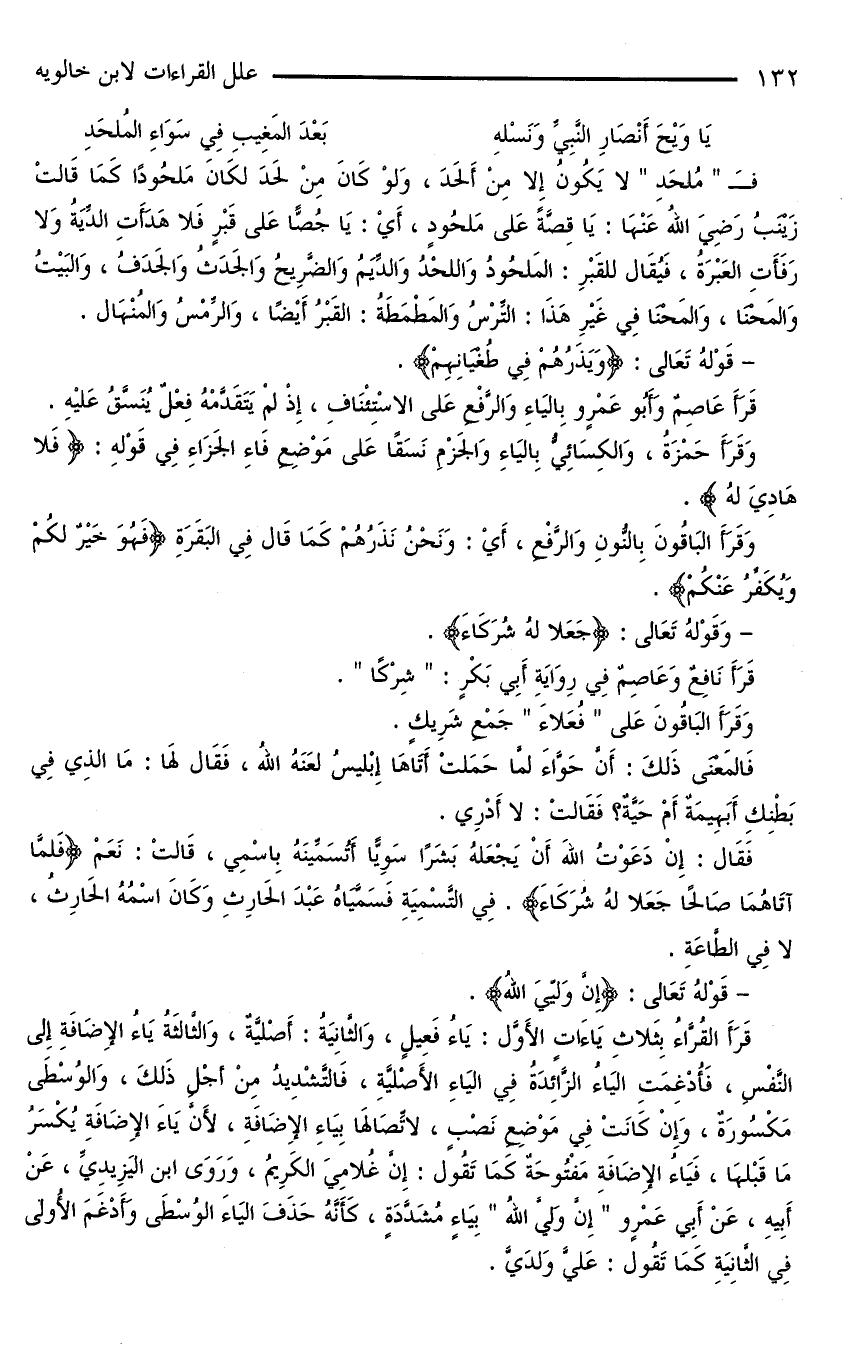 قَرَأَ الْقُرَّاءُ بِثَلَاثِ يَاءَاتٍ الْأَوَّلُ: يَاءُ فَعِيلٍ، وَالثَّانِيَةُ: أَصْلِيَّةٌ، وَالثَّالِثَةُ يَاءُ الْإِضَافَةِ إِلَى النَّفْسِ، فَأُدْغِمَتِ الْيَاءُ الزَّائِدَةُ فِي الْيَاءِ الْأَصْلِيَّةِ، فَالتَّشْدِيدُ مِنْ أجل ذَلِكَ، وَالْوُسْطَى مَكْسُورَةٌ، وَإِنْ كَانَتْ فِي مَوْضِعِ نَصْبٍ، لِاتِّصَالِهَا بِيَاءِ الْإِضَافَةِ، لِأَنَّ يَاءَ الْإِضَافَةِ يُكْسَرُ مَا قَبْلَهَا، فَيَاءُ الْإِضَافَةِ مَفْتُوحَةٌ كَمَا تَقُولُ: إِنَّ غُلَامِيَ الْكَرِيمُ، وَرَوَى ابْنُ الْيَزِيدِيِّ، عَنْ أَبِيهِ، عَنْ أَبِي عَمْرٍو «إِنَّ وَلِيَّ اللَّهُ» بِيَاءٍ مُشَدَّدَةٍ، كَأَنَّهُ حَذَفَ الْيَاءَ الْوُسْطَى وَأَدْغَمَ الْأُولَى فِي الثَّانِيَةِ كَمَا تَقُولُ: عَلَيَّ ولدي.