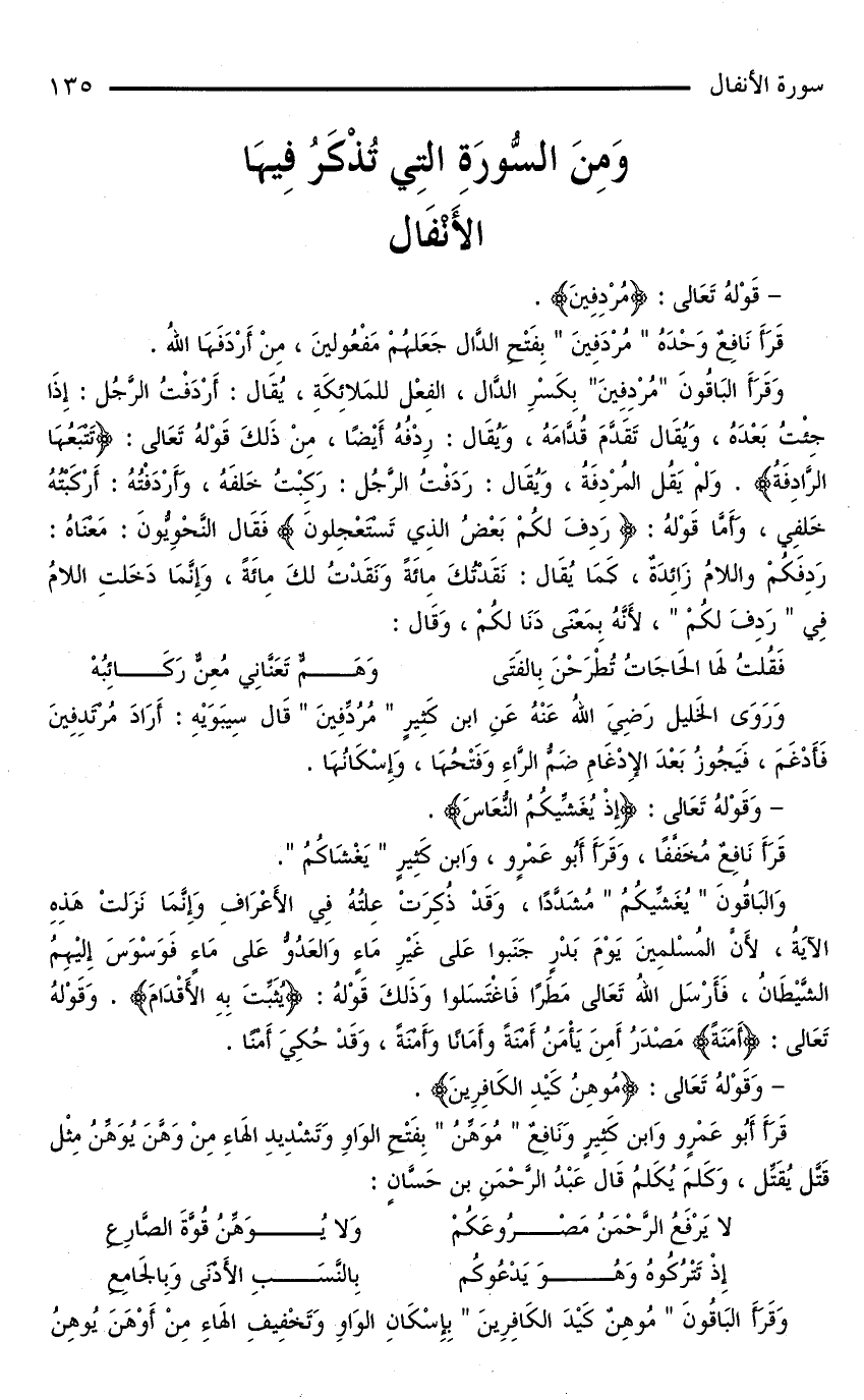 قَرَأَ نَافِعٌ وَحْدَهُ «مُرْدَفِينَ» بِفَتْحِ الدَّالِ جَعَلَهُمْ مَفْعُولِينَ، مِنْ أَرْدَفَهَا اللَّهُ.