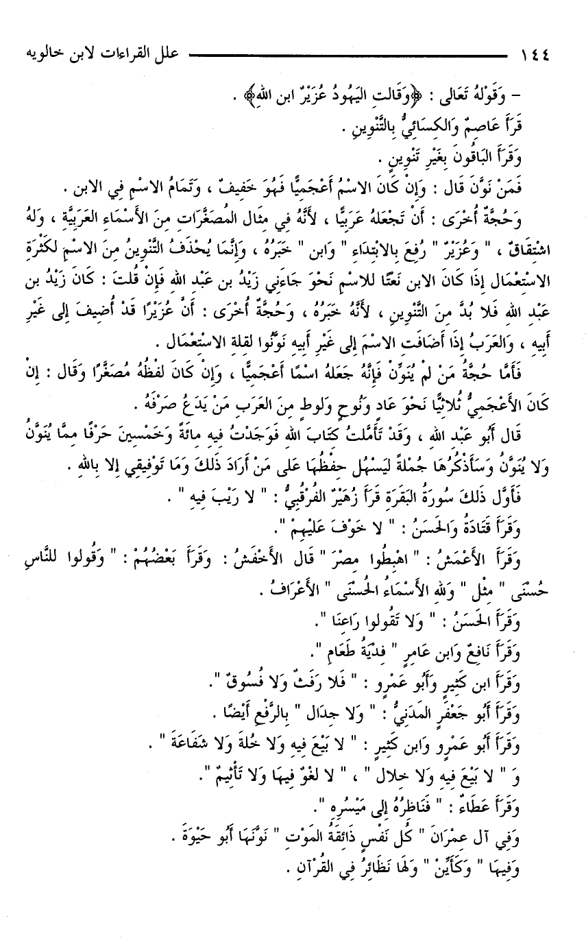 وَحُجَّةٌ أُخْرَى: أَنْ تَجْعَلَهُ عَرَبِيًّا، لِأَنَّهُ فِي مِثَالِ الْمُصَغَّرَاتِ مِنَ الْأَسْمَاءِ الْعَرَبِيَّةِ، وَلَهُ اشْتِقَاقٌ، «وَعُزَيْرٌ» رُفِعَ بِالِابْتِدَاءِ «وَابْنُ» خَبَرُهُ، وَإِنَّمَا يُحْذَفُ التَّنْوِينُ مِنَ الِاسْمِ لِكَثْرَةِ الِاسْتِعْمَالِ إِذَا كَانَ الِابْنُ نَعْتًا لِلِاسْمِ نَحْوَ جَاءَنِي زَيْدُ بْنُ عَبْدِ اللَّهِ فَإِنْ قُلْتَ: كَانَ زَيْدُ بْنَ عبد الله فلا بد مِنَ التَّنْوِينِ، لِأَنَّهُ خَبَرُهُ، وَحُجَّةٌ أُخْرَى: أَنَّ عزيزا قَدْ أُضِيفَ إِلَى غَيْرِ أَبِيهِ، وَالْعَرَبُ إِذَا أَضَافَتِ الِاسْمَ إِلَى غَيْرِ أَبِيهِ نَوَّنُوا لِقِلَّةِ الِاسْتِعْمَالِ.