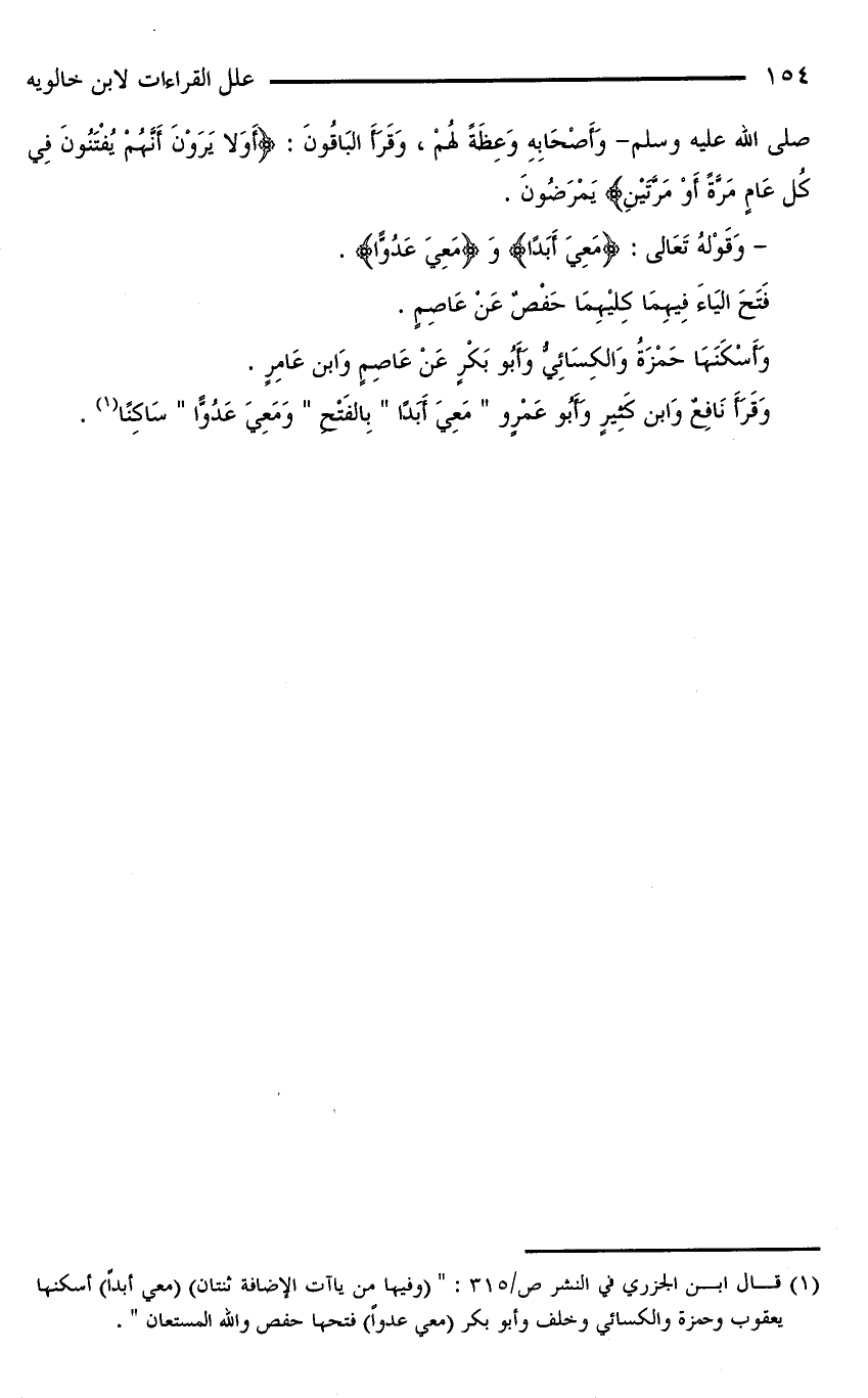 (¬١) قال ابن الجزري في النشر ص/ ٣١٥: «(وفيها من ياءات الإضافة ثنتان) (معي أبدا) أسكنها يعقوب وحمزة والكسائي وخلف وأبو بكر (معي عدوا) فتحها حفص والله المستعان».