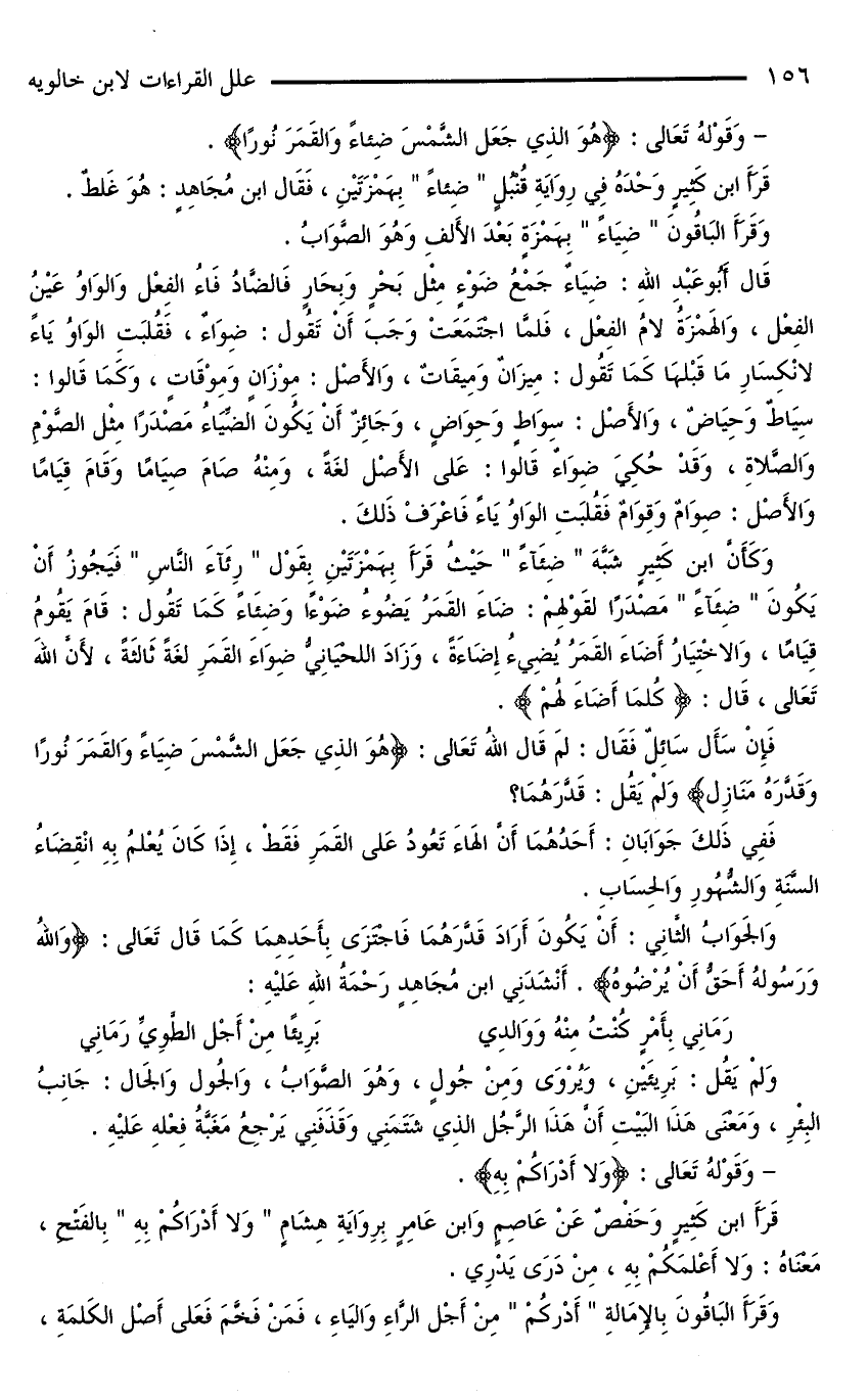 وَكَأَنَّ ابْنَ كَثِيرٍ شَبَّهَ «ضِئَآءً» حَيْثُ قَرَأَ بهمزتين بقول «رِئَآءَ النَّاسِ» فَيَجُوزُ أَنْ يَكُونَ «ضِئَآءً» مَصْدَرًا لِقَوْلِهِمْ: ضَاءَ الْقَمَرُ يَضُوءُ ضَوْءًا وَضِئَاءً كَمَا تَقُولُ: قَامَ يَقُومُ قِيَامًا، وَالِاخْتِيَارُ أَضَاءَ الْقَمَرُ يضيء إِضَاءَةً، وَزَادَ اللَّحْيَانِيُّ ضِوَاءَ الْقَمَرِ لُغَةً ثَالِثَةً، لِأَنَّ اللَّهَ تَعَالَى، قَالَ: {كُلَّمَا أَضَاءَ لَهُمْ}.