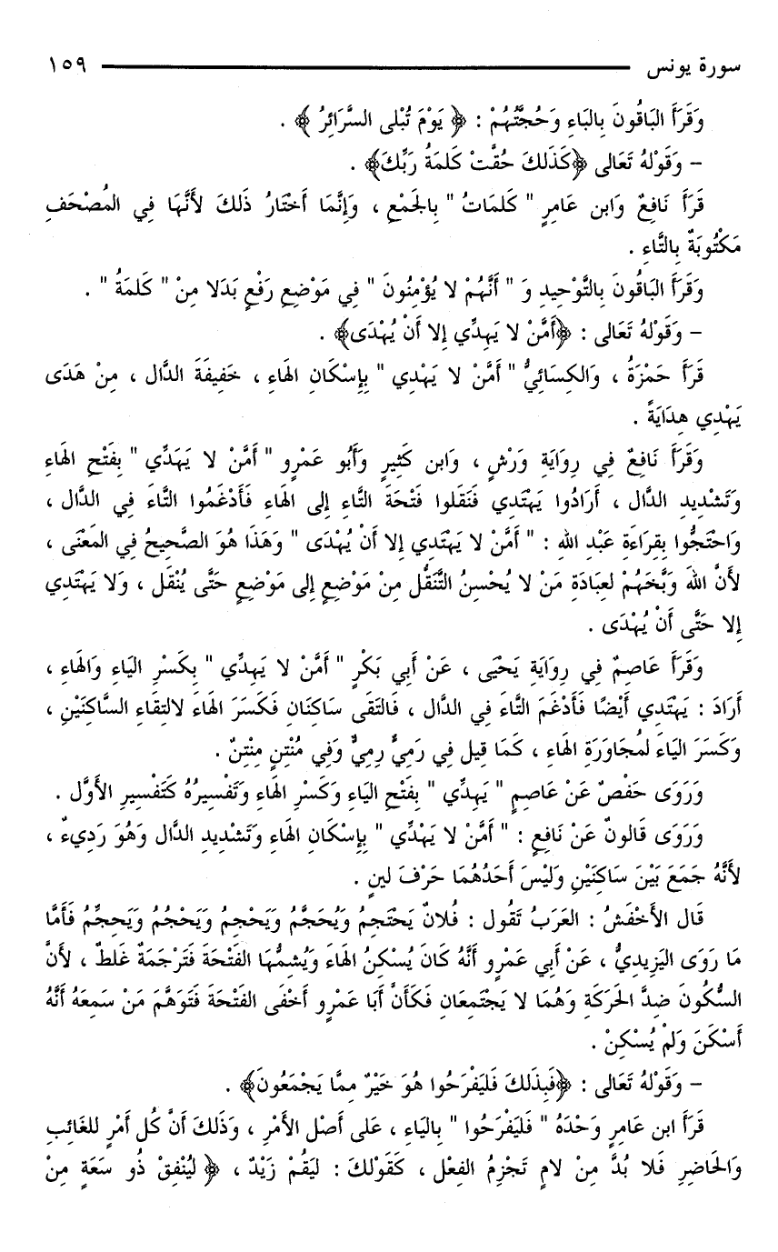 وَقَرَأَ نَافِعٌ فِي رِوَايَةِ وَرْشٍ، وَابْنُ كَثِيرٍ وَأَبُو عَمْرٍو «أَمَّنْ لَا يَهَدِّي» بِفَتْحِ الْهَاءِ وَتَشْدِيدِ الدَّالِ، أَرَادُوا يَهْتَدِي فَنَقَلُوا فَتْحَةَ التَّاءِ إِلَى الْهَاءِ فَأَدْغَمُوُا التَّاءَ فِي الدَّالِ، وَاحْتَجُّوا بِقِرَاءَةِ عَبْدِ اللَّهِ: «أَمَّنْ لَا يَهْتَدِي إِلَّا أَنْ يُهْدَى» وَهَذَا هُوَ الصَّحِيحُ فِي الْمَعْنَى، لِأَنَّ اللَّهَ وَبَّخَهُمْ لِعِبَادَةِ مَنْ لَا يُحْسِنُ التَّنَقُّلَ مِنْ مَوْضِعٍ إِلَى مَوْضِعٍ حَتَّى يُنْقَلَ، وَلَا يَهْتَدِي إِلَّا حَتَّى أَنْ يُهْدَى.