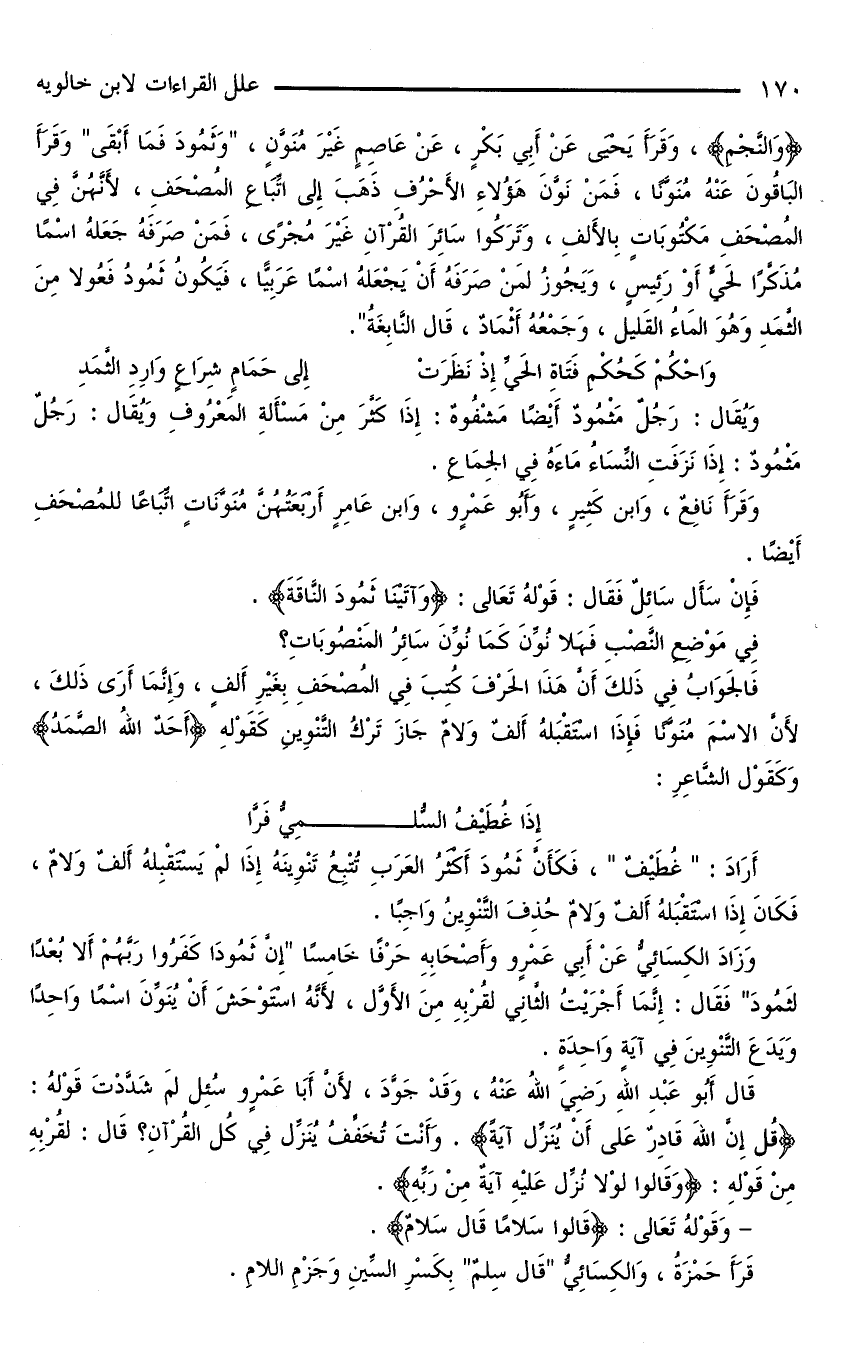وَالنَّجْمِ، وَقَرَأَ يَحْيَى عَنْ أَبِي بَكْرٍ، عَنْ عَاصِمٍ غَيْرَ مُنَوَّنٍ، «وَثَمُودَ فَمَا أَبْقَى» وَقَرَأَ الْبَاقُونَ عَنْهُ مُنَوَّنًا، فَمَنْ نَوَّنَ هَؤُلَاءِ الْأَحْرُفِ ذَهَبَ إِلَى اتِّبَاعِ الْمُصْحَفِ، لِأَنَّهُنَّ فِي الْمُصْحَفِ مَكْتُوبَاتٍ بِالْأَلِفِ، وَتَرَكُوا سَائِرَ الْقُرْآنِ غَيْرَ مُجْرًى، فَمَنْ صَرَفَهُ جَعَلَهُ اسْمًا مُذَكَّرًا لِحَيٍّ أَوْ رَئِيسٍ، وَيَجُوزُ لِمَنْ صَرَفَهُ أَنْ يَجْعَلَهُ اسْمًا عَرَبِيًّا، فَيَكُونُ ثَمُودُ فَعُولًا مِنَ الثَمَدِ وَهُوَ الْمَاءُ الْقَلِيلُ، وَجَمْعُهُ أَثْمَادٌ، قَالَ النَّابِغَةُ».