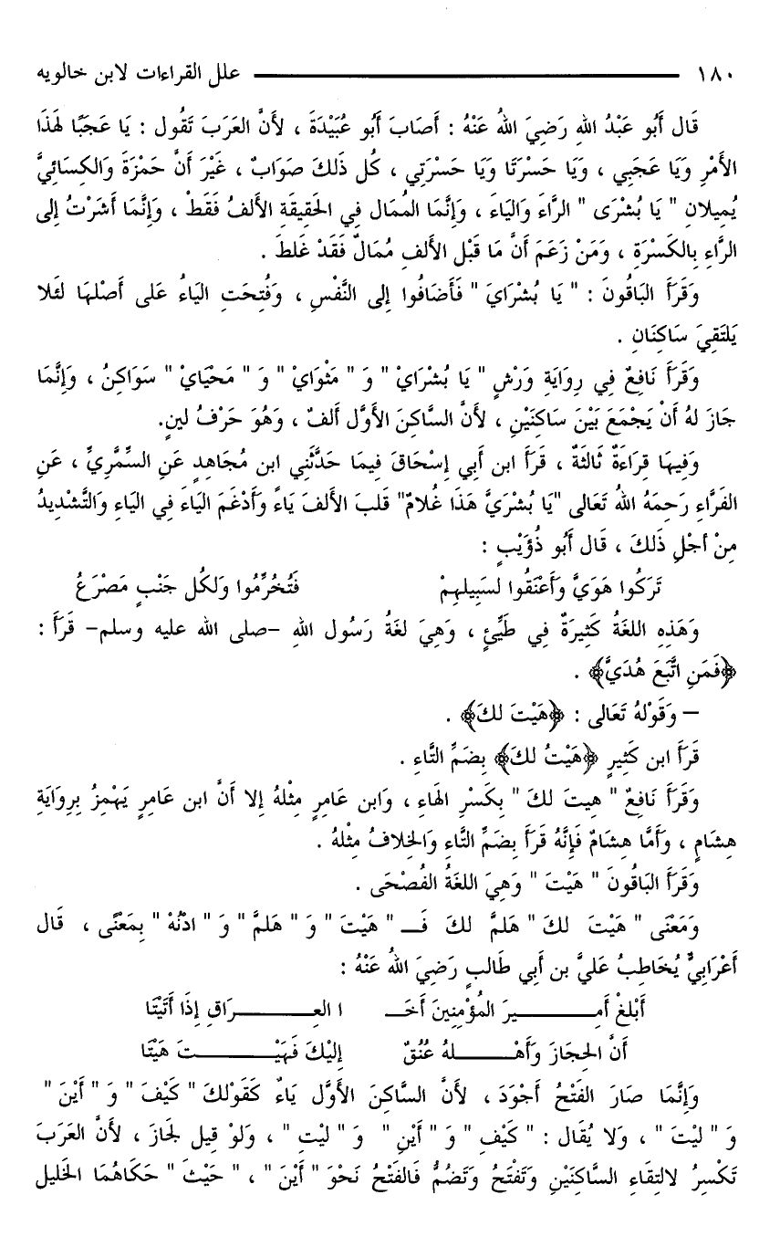 قال أبو عبد الله رضي الله عنه: أصاب أبو عبيدة، لِأَنَّ الْعَرَبَ تَقُولُ: يَا عَجَبًا لِهَذَا الْأَمْرِ وَيَا عَجَبِي، وَيَا حَسْرَتَا وَيَا حَسْرَتِي، كُلُّ ذَلِكَ صَوَابٌ، غَيْرَ أَنَّ حَمْزَةَ وَالْكِسَائِيَّ يُمِيلَانِ «يَا بُشْرَى» الرَّاءَ وَالْيَاءَ، وَإِنَّمَا الْمُمَالُ فِي الْحَقِيقَةِ الْأَلِفُ فَقَطْ، وَإِنَّمَا أَشَرْتُ إِلَى الرَّاءِ بِالْكَسْرَةِ، وَمَنْ زَعَمَ أَنَّ مَا قَبْلَ الْأَلِفِ مُمَالٌ فَقَدْ غَلِطَ.