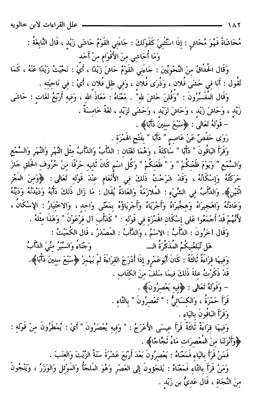 وَقَرَأَ الْبَاقُونَ «دَأْبًا» سَاكِنَةً، وَهُمَا لُغَتَانِ: الدَّأْبُ وَالدَّأَبُ مِثْلَ النَّهْرِ وَالنَّهَرِ وَالسَّمْعِ وَالسَّمَعِ «وَيَوْمَ ظَعْنِكُمْ» وَ «ظَعَنِكُمْ» وَكُلُّ اسْمٍ كَانَ ثَانِيهِ حَرْفًا مِنْ حُرُوفِ الْحَلْقِ جَازَ حَرَكَتُهُ وَإِسْكَانُهُ، وَقَدْ شَرَحْتُ ذَلِكَ فِي الْأَنْعَامِ عِنْدَ قَوْلِهِ تَعَالَى: {وَمِنَ الْمَعِزِ اثْنَيْنِ}. وَالدَّأْبُ فِي الشَّيْءِ: الْمُلَازَمَةُ وَالْعَادَةُ يُقَالُ: مَا زَالَ ذَلِكَ دَأْبُهُ وَدَيْدَنُهُ وَدَيْنُهُ وَعَادَتُهُ وَاهَجِيرَاهُ وَهِجِّيرَاهُ وَأَجْرَيَاهُ وَأَجْرِيَاؤُهُ بِمَعْنًى وَاحِدٍ، وَالِاخْتِيَارُ: الِإسْكَانُ، لِأَنَّهُمْ قَدْ أَجْمَعُوا عَلَى إِسْكَانِ الْهَمْزَةِ فِي قَوْلِهِ: «كَدَأْبِ آلِ فِرْعَوْنَ» وَهَذَا مِثْلُهُ.