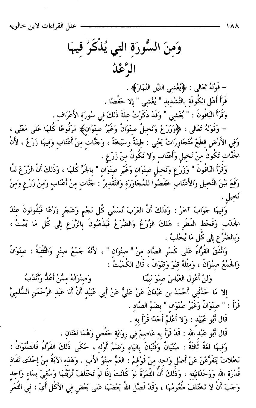 إِلَّا مَا حَدَّثَنِي أحمد بن عبدان عن علي عن أبي عُبَيْدٍ أَنَّ أَبَا عَبْدِ الرَّحْمَنِ السُّلَمِيَّ قَرَأَ: «صِنْوَانٌ وَغَيْرُ صُنْوَانٍ» بِضَمِّ الصَّادِ.