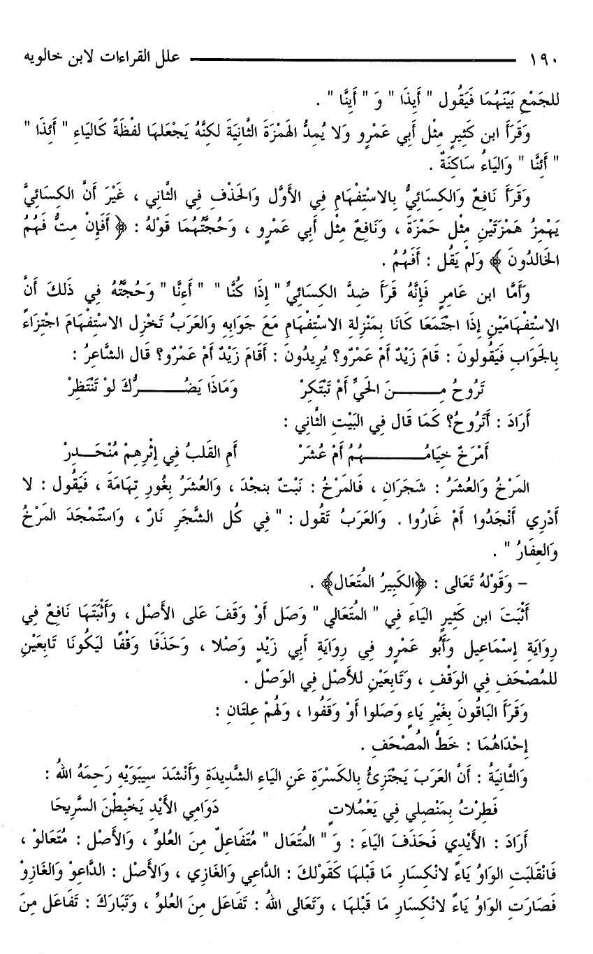 أَثْبَتَ ابْنُ كَثِيرٍ الْيَاءَ فِي «الْمُتَعَالِي» وَصَلَ أَوْ وَقَفَ عَلَى الْأَصْلِ، وَأَثْبَتَهَا نَافِعٌ فِي رِوَايَةِ إِسْمَاعِيلَ وَأَبُو عَمْرٍو فِي رِوَايَةِ أَبِي زَيْدٍ وَصْلًا، وَحَذَفَا وَقْفًا لِيَكُونَا تَابِعَيْنِ لِلْمُصْحَفِ فِي الْوَقْفِ، وَتَابِعَيْنِ لِلْأَصْلِ فِي الْوَصْلِ.