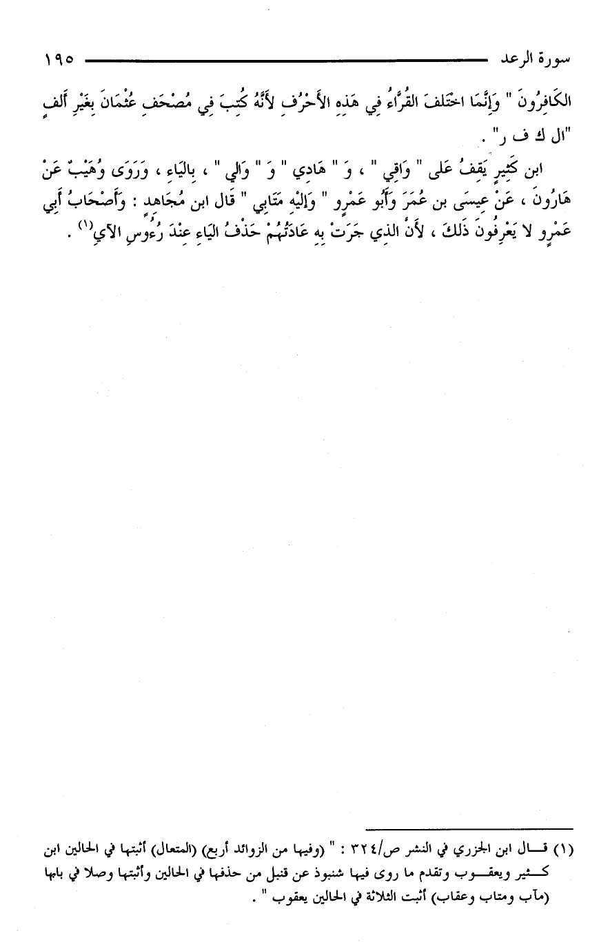 ابْنُ كَثِيرٍ يَقِفُ عَلَى «وَاقِي»، وَ «هَادِي» وَ «وَالِي»، بِالْيَاءِ، وَرَوَى وُهَيْبٌ عَنْ هَارُونَ، عَنْ عِيسَى بْنِ عُمَرَ وَأَبُو عَمْرٍو «وَإلَيْهِ مَتَابِي» قَالَ ابْنُ مُجَاهِدٍ: وَأَصْحَابُ أَبِي عَمْرٍو لَا يَعْرِفُونَ ذَلِكَ، لِأَنَّ الَّذِي جَرَتْ بِهِ عَادَتُهُمْ حَذْفُ الْيَاءِ عند رءوس الآي (¬١).