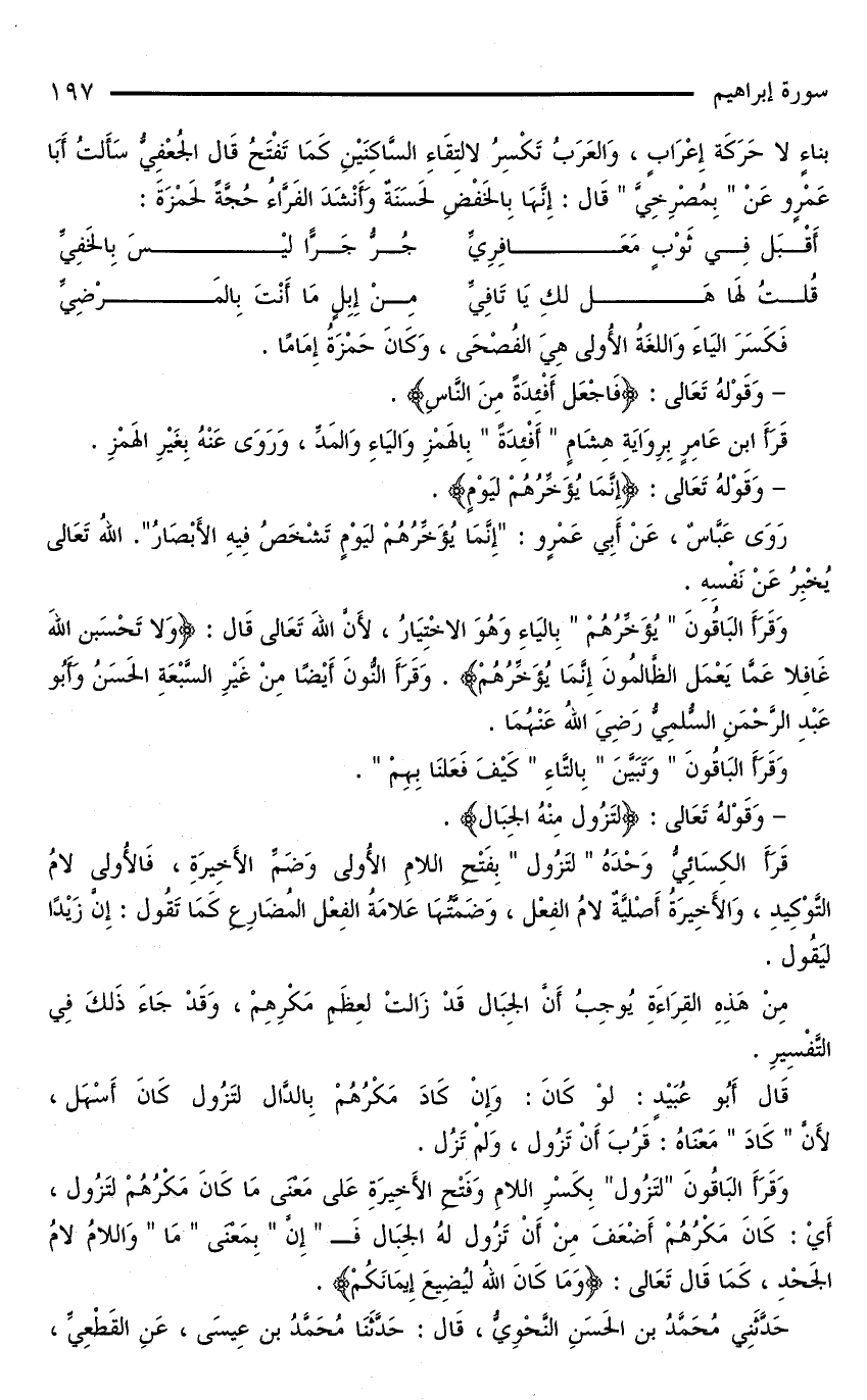 قَالَ أَبُو عُبَيْدٍ: لَوْ كَانَ: وَإِنْ كَادَ مَكْرُهُمْ بِالدَّالِ لِتَزُولَ كَانَ أَسْهَلَ، لِأَنَّ «كَادَ» مَعْنَاهُ: قَرُبَ أَنْ تَزُولَ، وَلَمْ تَزُلْ.