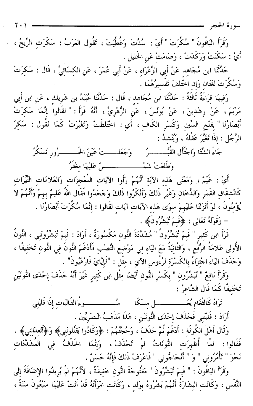 وَقَرَأَ الْبَاقُونَ «سُكِّرَتْ» أَيْ: سُدَّتْ وَغُطِّيَتْ، تَقُولُ الْعَرَبُ: سَكَرَتِ الرِّيحُ، أَيْ: سَكَنَتْ وَرَكَدَتْ، وَصَامَتْ عَنِ الْخَلِيلِ.