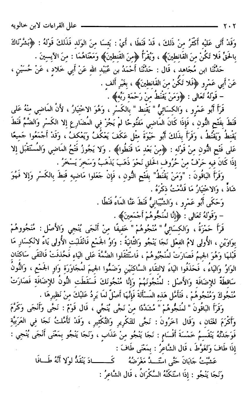 قَرَأَ أَبُو عَمْرٍو، وَالْكِسَائِيُّ «يَقْنِطْ» بِالْكَسْرِ، وَهُوَ الِاخْتِيَارُ، لِأَنَّ الْمَاضِي مِنْهُ عَلَى قَنَطَ بِفَتْحِ النُّونِ، فَإِذَا كَانَ الْمَاضِي مَفْتُوحًا لَمْ يَجُزْ فِي الْمُضَارِعِ إِلَّا الْكَسْرِ وَالضَّمِّ قَنَطَ يَقْنِطُ وَيَقْنُطُ، وَقَرَأَ بِذَلِكَ أَبُو حَيْوَةَ مِثْلَ عَكَفَ يَعْكُفُ وَيَعْكِفُ، وَقَدْ أَجْمَعُوا جَمِيعًا عَلَى فَتْحِ النُّونِ مِنْ قَوْلِهِ: {مِنْ بَعْدِ مَا قَنَطُوا}. وَلَا يَجُوزُ فَتْحُ الْمَاضِي وَالْمُسْتَقْبَلِ إِلَّا إِذَا كَانَ فِيهِ حَرْفٌ مِنْ حُرُوفِ الْحَلْقِ نَحْوَ ذَهَبَ يَذْهَبُ وَسَخِرَ يَسْخَرُ.