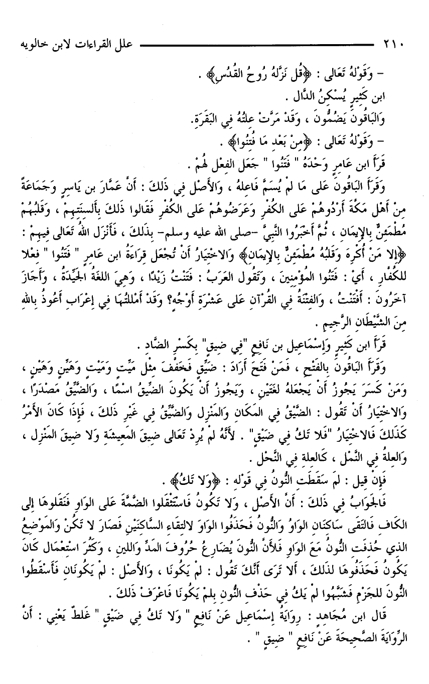 وَقَرَأَ الْبَاقُونَ بِالْفَتْحِ، فَمَنْ فَتَحَ أَرَادَ: ضَيِّقٍ فَخَفَّفَ مِثْلَ مَيِّتٍ وَمَيْتٍ وَهَيِّنٍ وَهَيْنٍ، وَمَنْ كَسَرَ يَجُوزُ أَنْ يَجْعَلَهُ لُغَتَيْنِ، وَيَجُوزُ أَنْ يَكُونَ الضِّيقُ اسْمًا، وَالضَّيِّقُ مَصْدَرًا، وَالِاخْتِيَارُ أَنْ تَقُولَ: الضَّيْقُ فِي الْمَكَانِ وَالْمَنْزِلِ وَالضَّيِّقُ فِي غَيْرِ ذَلِكَ، فَإِذَا كَانَ الْأَمْرُ كَذَلِكَ فَالِاخْتِيَارُ «فَلَا تَكُ فِي ضَيْقٍ». لِأَنَّهُ لَمْ يُرِدْ تَعَالَى ضِيقَ الْمَعِيشَةِ وَلَا ضِيقَ الْمَنْزِلِ، وَالْعِلَّةُ فِي النَّمْلِ، كَالْعِلَّةِ فِي النَّحْلِ.
