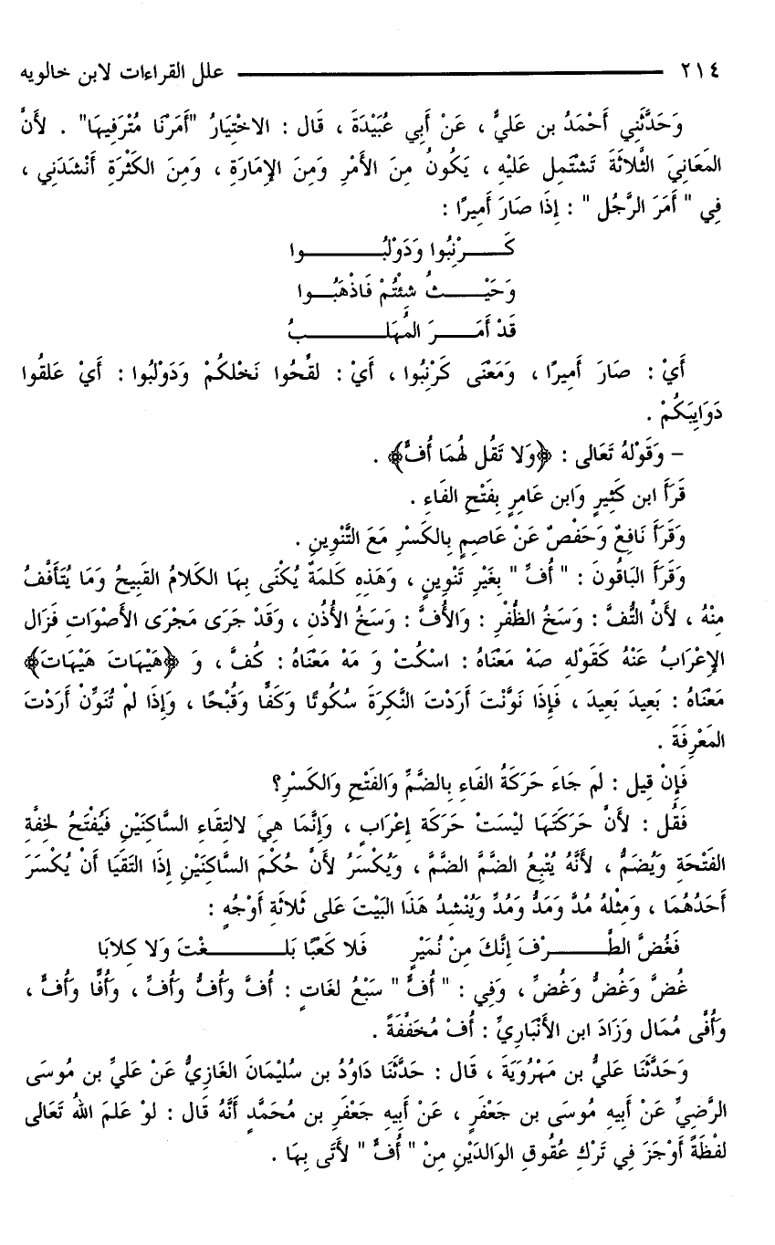 غُضَّ وَغُضُّ وَغُضِّ، وَفِي: «أُفٍّ» سَبْعُ لُغَاتٍ: أُفَّ وَأُفُّ وَأُفِّ، وَأُفًّا وَأُفٍّ، وَأُفَّى مُمَالُ وَزَادَ ابْنُ الْأَنْبَارِيِّ: أُفْ مُخَفَّفَةً.