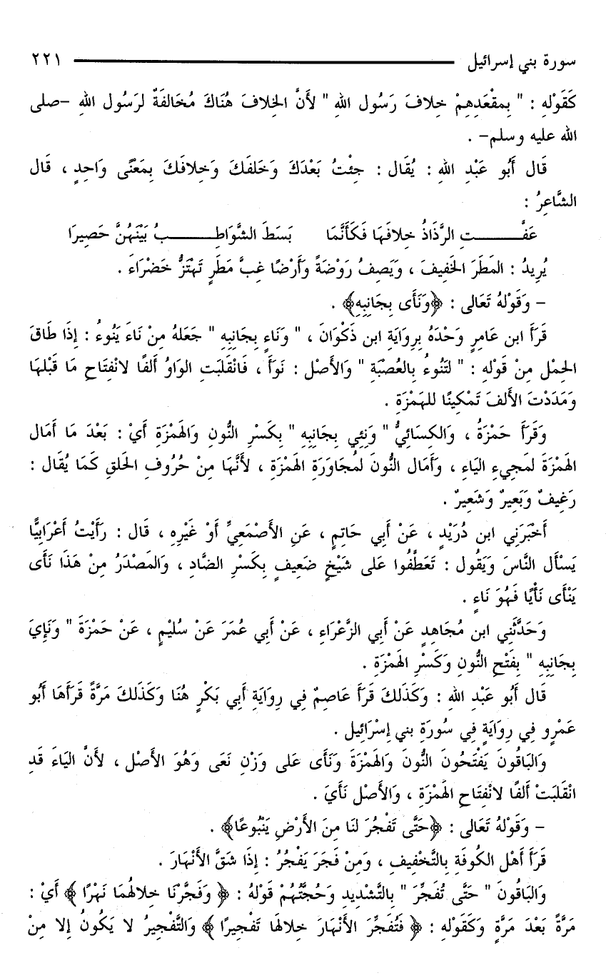 قَالَ أَبُو عَبْدِ اللَّهِ: وَكَذَلِكَ قَرَأَ عَاصِمٌ فِي رِوَايَةِ أَبِي بَكْرٍ هُنَا وَكَذَلِكَ مَرَّةً قَرَأَهَا أَبُو عَمْرٍو فِي رِوَايَةٍ فِي سُورَةِ بَنِي إِسْرَائِيلَ.
