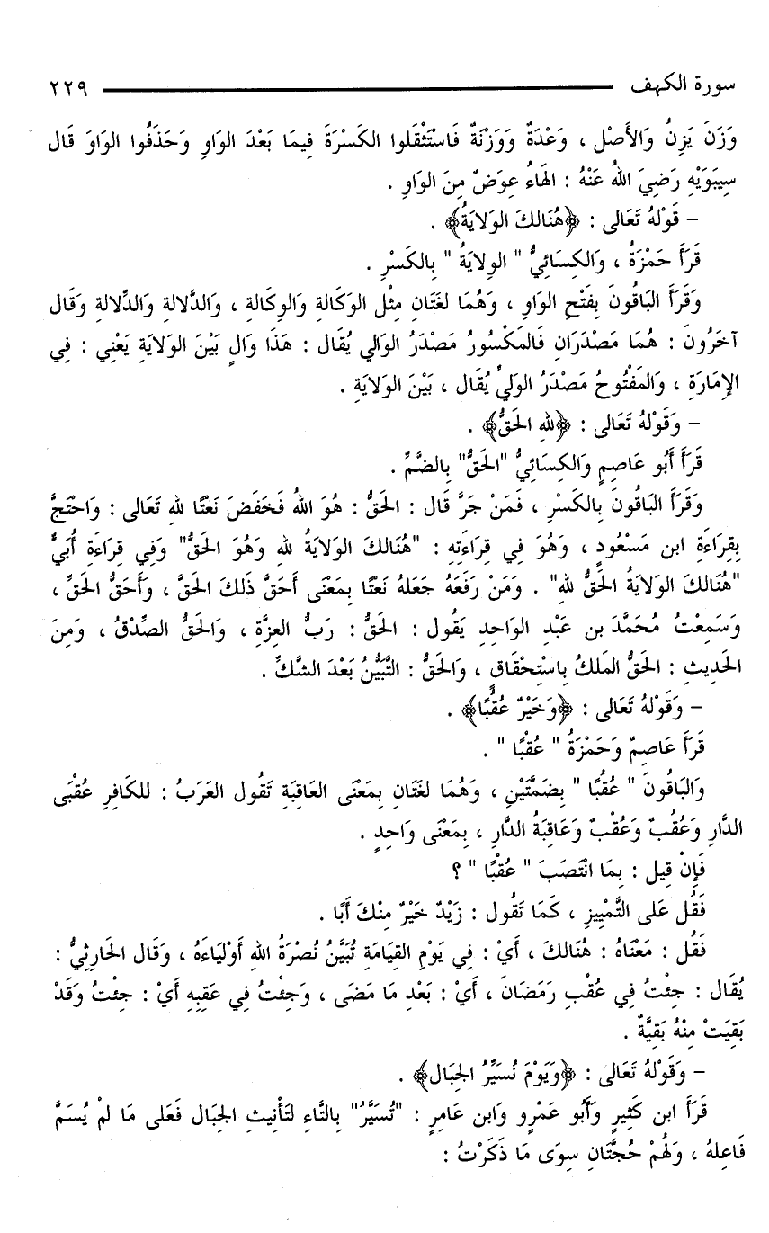 وَقَرَأَ الْبَاقُونَ بِالْكَسْرِ، فَمَنْ جَرَّ قَالَ: الْحَقُّ: هُوَ اللَّهُ فَخَفَضَ نَعْتًا لِلَّهِ تَعَالَى: وَاحْتَجَّ بِقِرَاءَةِ ابْنِ مَسْعُودٍ، وَهُوَ فِي قِرَاءَتِهِ: «هُنَالِكَ الْوَلَايَةُ لِلَّهِ وَهُوَ الْحَقُّ» وَفِي قِرَاءَةِ أُبَيٍّ «هُنَالِكَ الْوَلَايَةُ الْحَقُّ لِلَّهِ». وَمَنْ رَفَعَهُ جَعَلَهُ نَعْتًا بِمَعْنَى أَحَقَّ ذَلِكَ الْحَقَّ، وَأَحَقُّ الْحَقِّ، وَسَمِعْتُ مُحَمَّدَ بْنَ عَبْدِ الْوَاحِدِ يَقُولُ: الْحَقُّ: رَبُّ الْعِزَّةِ، وَالْحَقُّ الصِّدْقُ، وَمِنَ الْحَدِيثِ: الْحَقُّ الْمَلِكُ بِاسْتِحْقَاقٍ، وَالْحَقُّ: التَّبَيُّنُ بَعْدَ الشَّكِّ.