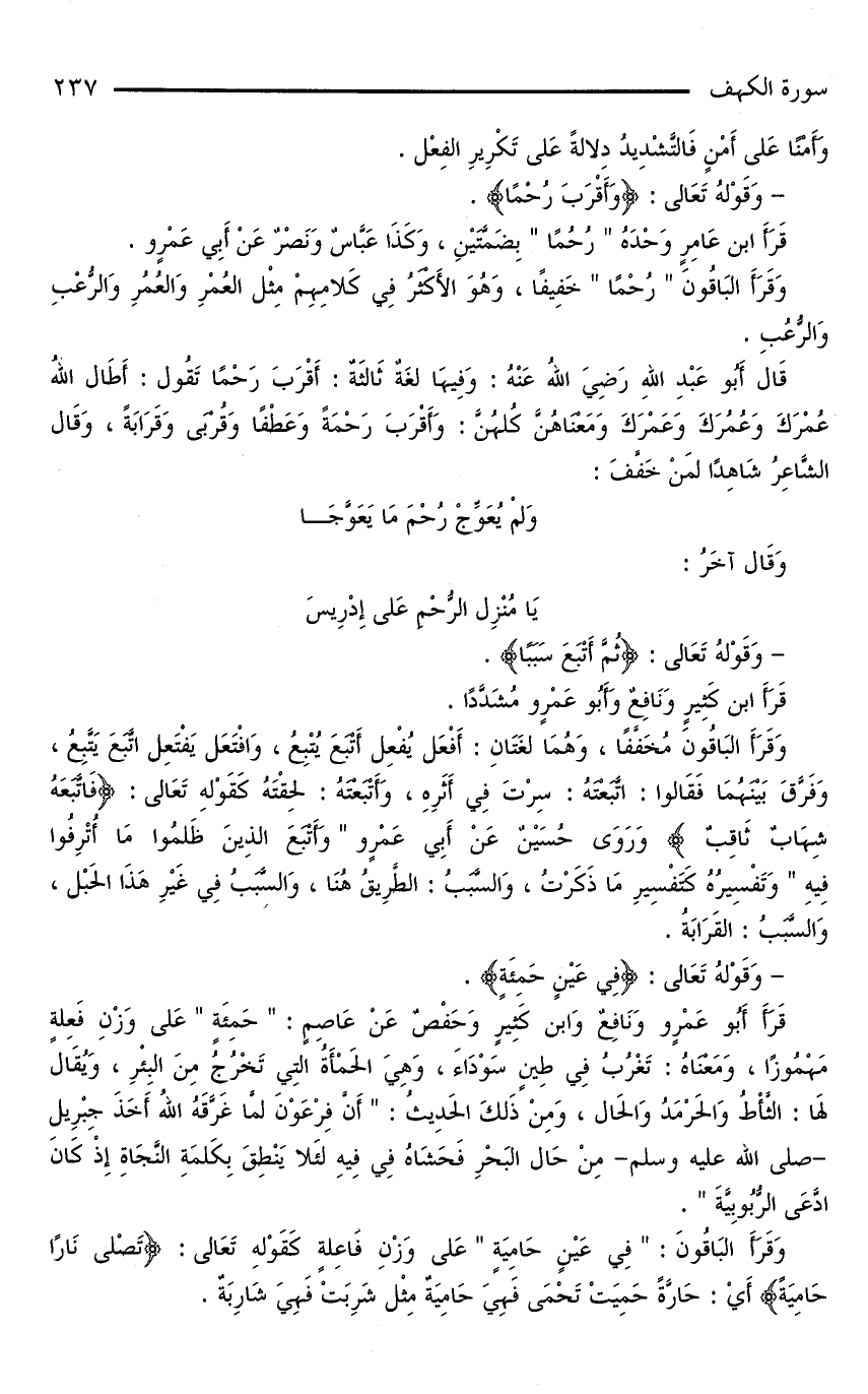 قَالَ أَبُو عَبْدِ اللَّهِ رَضِيَ اللَّهُ عَنْهُ: وَفِيهَا لُغَةٌ ثَالِثَةٌ: أَقْرَبَ رَحْمًا تَقُولُ: أَطَالَ اللَّهُ عُمْرَكَ وَعُمُرَكَ وَعَمْرَكَ وَمَعْنَاهُنَّ كُلُّهُنَّ: وَأَقْرَبَ رَحْمَةً وَعَطْفًا وَقُرْبَى وَقَرَابَةً، وَقَالَ الشَّاعِرُ شَاهِدًا لِمَنْ خَفَّفَ: