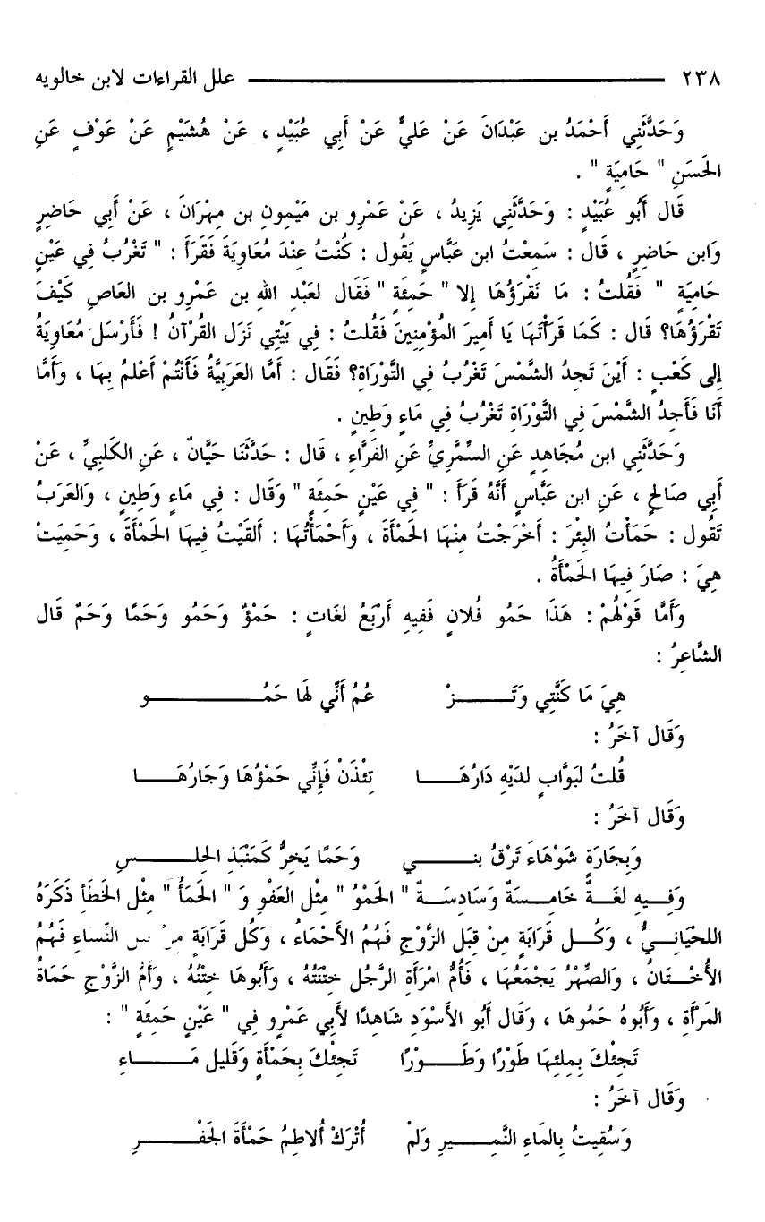 قَالَ أَبُو عُبَيْدٍ: وَحَدَّثَنِي يَزِيدُ، عَنْ عَمْرِو بْنِ مَيْمِونِ بْنِ مِهْرَانَ، عَنْ أَبِي حَاضِرٍ وَابْنِ حَاضِرٍ، قَالَ: سَمِعْتُ ابْنَ عَبَّاسٍ يَقُولُ: كُنْتُ عِنْدَ مُعَاوِيَةَ فَقَرَأَ: «تَغْرُبُ فِي عَيْنٍ حَامِيَةٍ» فَقُلْتُ: مَا نَقْرَؤُهَا إِلَّا «حَمِئَةٍ» فَقَالَ لِعَبْدِ اللَّهِ بْنِ عَمْرِو بْنِ الْعَاصِ كَيْفَ تَقْرَؤُهَا؟ قَالَ: كَمَا قَرَأْتَهَا يَا أَمِيرَ الْمُؤْمِنِينَ فَقُلْتُ: فِي بَيْتِي نَزَلَ الْقُرْآنُ! فَأَرْسَلَ مُعَاوِيَةُ إِلَى كَعْبٍ: أَيْنَ تَجِدُ الشَّمْسَ تَغْرُبُ فِي التَّوْرَاةِ؟ فَقَالَ: أَمَّا الْعَرَبِيَّةُ فَأَنْتُمْ أَعْلَمُ بِهَا، وَأَمَّا أَنَا فَأَجِدُ الشَّمْسَ فِي التَّوْرَاةِ تَغْرُبُ فِي مَاءٍ وَطِينٍ.