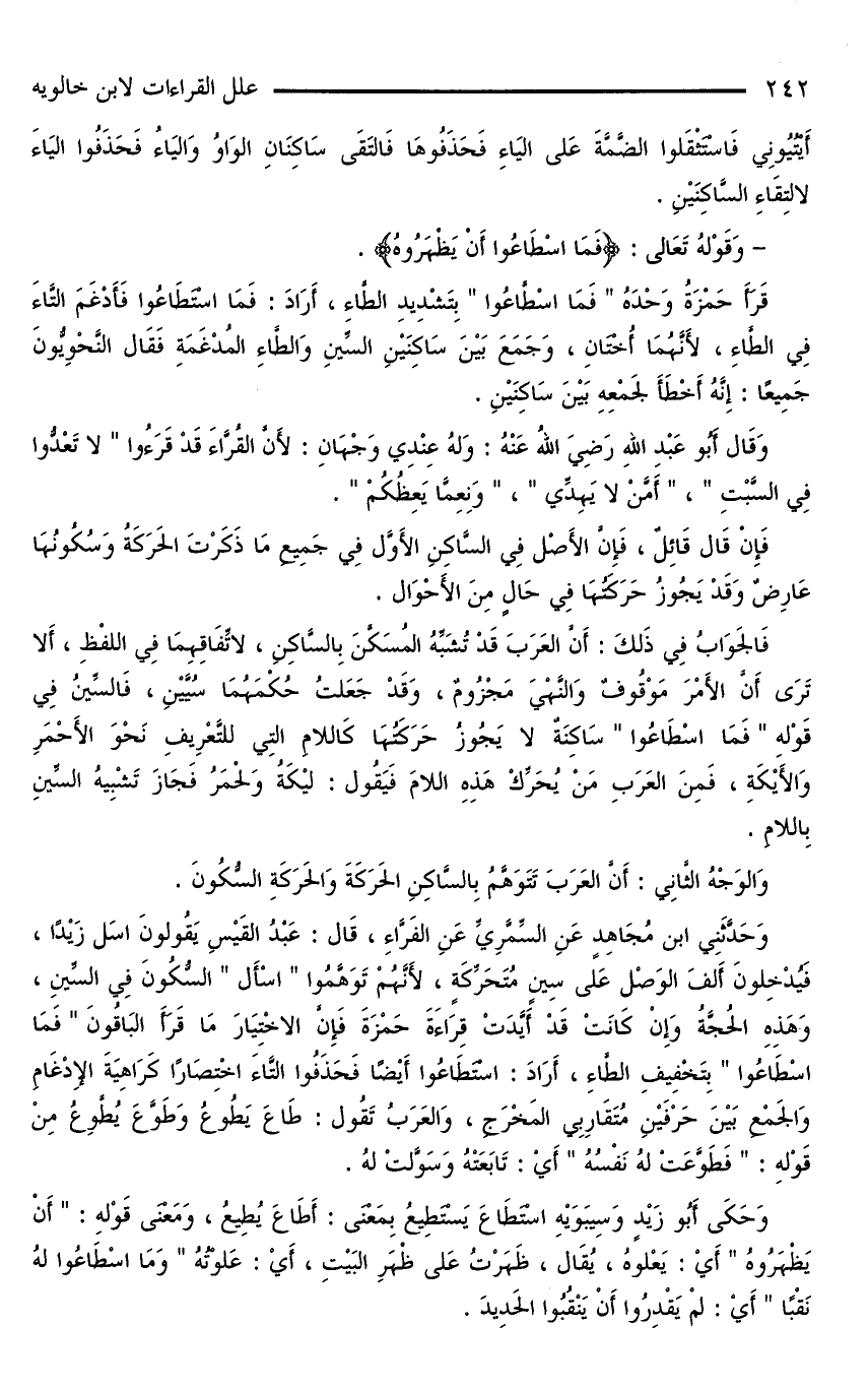 وَحَدَّثَنِي ابن مجاهد عن السمري عن الفراء، قال: عَبْدُ الْقَيْسِ يَقُولُونَ اسَلْ زَيْدًا، فَيُدْخِلُونَ أَلِفَ الْوَصْلِ عَلَى سِينٍ مُتَحَرِّكَةٍ، لِأَنَّهُمْ تَوَهَّمُوا «إسْأَلْ» السُّكُونَ فِي السِّينِ، وَهَذِهِ الْحُجَّةُ وَإِنْ كَانَتْ قَدْ أَيَّدَتْ قِرَاءَةَ حَمْزَةَ فَإِنَّ الِاخْتِيَارَ مَا قَرَأَ الْبَاقُونَ «فَمَا اسْطَاعُوا» بِتَخْفِيفِ الطَّاءِ، أَرَادَ: اسْتَطَاعُوا أَيْضًا فَحَذَفُوُا التَّاءَ اخْتِصَارًا كَرَاهِيَةَ الْإِدْغَامِ وَالْجَمْعِ بَيْنَ حَرْفَيْنِ مُتَقَارِبِي الْمَخْرَجِ، وَالْعَرَبُ تَقُولُ: طَاعَ يَطُوعُ وَطَوَّعَ يُطَّوِعُ مِنْ قَوْلِهِ: «فَطَوَّعَتْ لَهُ نَفْسُهُ» أَيْ: تَابَعَتْهُ وَسَوَّلَتْ لَهُ.