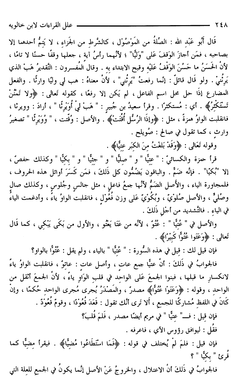 قَالَ أَبُو عَبْدِ الله: الصِّلةُ من المَوْصُوْلِ، كالشَّرطِ من الجَزاءِ، لا يَتِمُّ أحدهما إلَّا بصاحبه، فمَن أجازَ الوَقفَ عَلَى «وَليًّا»؛ لأنَّهما رأسُ آيةٍ، جعلها وقفًا حسنًا لا تامًا، لأنَّ الحَسَنُ ما حَسُنَ الوَقْفُ عَلَيْهِ وقُبح الابتداء بِهِ. وقال المُفسرون: التَّقديرُ هَبْ الّذي يَرِثُنيْ. ولو قَالَ قائلٌ: إنّما رفعتُ «يَرِثُني»، لأنَّ معناهُ: هب لي وليًا وارثًا. والفعلُ المضارع إذَا حلَّ محلَّ اسمِ الفاعلِ، لم يَكن إلَّا رفعًا، كقوله تَعالى: {ولا تَمْنُنْ تَسْتَكْثِرُ}. أي: مُستكثرًا. وقرأ سعيدُ بن جُبيرٍ: «هَبْ لِيْ أُوَيْرِثًا»، أرادَ: وويرثا، فانقلبت الواوُ همزةً، مثل: {وإذَا الرُسُّلُ أُقِّتَتْ}. والأصل: وُقّتت، «وو يرثا» تصغيرُ وارثٍ، كما تقولُ في صالح: صُويلح.