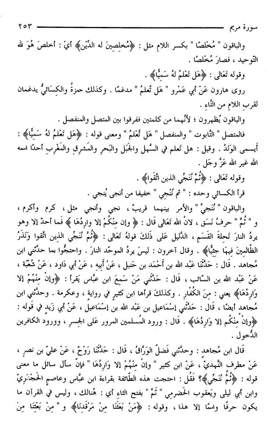 والباقون «نُنَجيِّ» والأمر بينهما قريبٌ، نجي وأنجي مثل، كرم وأكرم، و «ثُمَّ» حرفُ نَسَق، لأنَّ الله تَعَالَى قَالَ: {وإن مِنْكُمْ إلَّا وارِدُهَا} فَما أحدٌ إلّا وهو يردُ النارَ تَحِلَّةَ القَسَمِ، الدَّليلُ عَلَى ذَلِكَ قولُهُ تَعَالَى: {ثُمَّ نُنَجِّي الذِين اتَّقوَا وَنَذَرُ الظَّالمِينَ فِيهَا جِثِيًّا}. وقال آخرون: لَيسَ يردُ الموحّد النارَ. واحتّجُّوا بما حدَّثني ابنُ مُجاهد. قَالَ: حَدَّثَنَا عَبْد الله بْن أَحْمَد بْن حَنبل، عَنْ أَبِيهِ، عَنْ أبي دَاود، عَنْ شُعْبَة، عَنْ عَبْد الله بْن السّائب، قَالَ: حَدَّثَني مَنْ سَمِعَ ابنَ عبَّاس يَقرأ: «وإنْ مِنْهُمْ إلّا وَارِدُهَا» يعني: مِنَ الكُفَّارِ. وكذلِكَ قرأها ابنُ كثيرٍ في روايةٍ، وعكرمة. وحدَّثني ابنُ مُجاهدٍ أيضًا، قَالَ: حَدَّثَني إسْمَاعيل بْن عَبْد الله بْن إسْمَاعيل، عَنْ أبي زَيدٍ في قَوله: