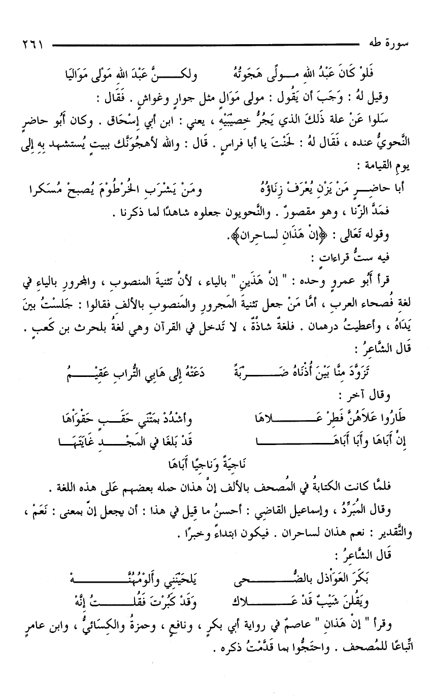 قرأ أَبُو عمروٍ وحده: «إنَّ هَذَينِ» بالياء، لأنَّ تثنيةَ المنصوبِ، والمجرورِ بالياءِ في لغةِ فُصحاء العربِ، أمَّا مَنْ جعلَ تثنيةَ المَجرورِ والمَنصوبِ بالألفِ فقالُوا: جَلَسْتُ بينَ يَدَاهُ، وأعطيتُ درهمان. فلغةٌ شاذَّةٌ، لا تَدخلُ في القرآن وهي لغةُ بلحرث بْن كَعبٍ.