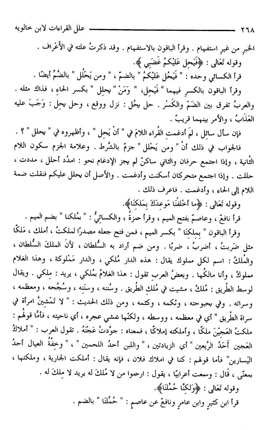 وقرأ الباقون «بِمِلْكِنَا» بكسر الميمِ، فمن فتح جعله مصدرًا لملكتُ، أملك، مَلكًا مثل ضَربتُ، أضربُ، ضرَبًا. ومن ضم أراد به السُّلطان، لأنَ الملُكَ السُّلطان، والمُلْكُ: اسم لكل مملوك يقال: هذه الدار مُلكي، والدار مَمْلُوكة، وهذا الغلام مملوكٌ، وأنا مالِكُها. وبعضُ العربِ تقول: هذا الغلامُ بمُلكي، يريد: مِلْكي. ويقال لوسط الطَّريق: مُلْكٌ، مشيت في مُلكِ الطَّريق. وسنُنه، وسنَنِه، وسُجُحه، ومعظمه، وسراته. وفي بحبوحته، وثكمه، وكثمه، ومن ذلك الحديث: «لا تَمْشِينَّ امرأة في سراة الطَّريق» أي في معظمه، ووسطه، ولكنّها تمشي عجره، أي ناحيته، فأمَّا قولُهُم: