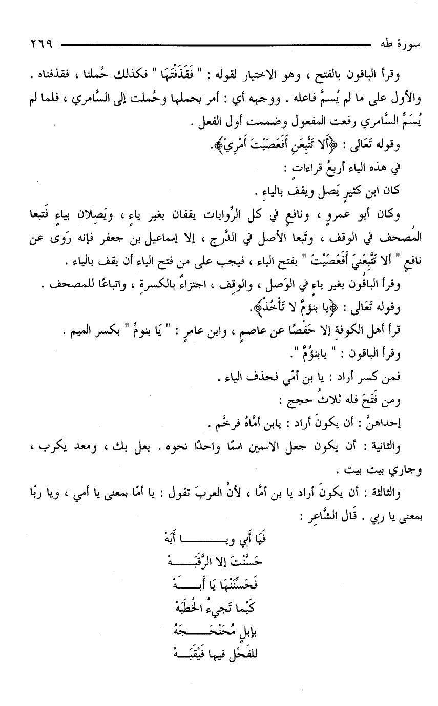 وكان أبو عمروٍ، ونافعٍ في كلِّ الرِّوايات يقفان بغير ياءٍ، ويَصِلان بياءٍ فَتبعا المُصحف في الوقف، وتَبعا الأصل في الدَّرج، إلا إسماعيل بن جعفر فإنه رَوى عن نافعٍ «ألَّا تَتَّبِعَنيَ أَفَعَصَيْتَ» بفتح الياء، فيجب على من فتح الياء أن يقف بالياء.
